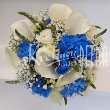 Okrągły bukiet ślubny z lilii calla, róż, hortensji nr 557