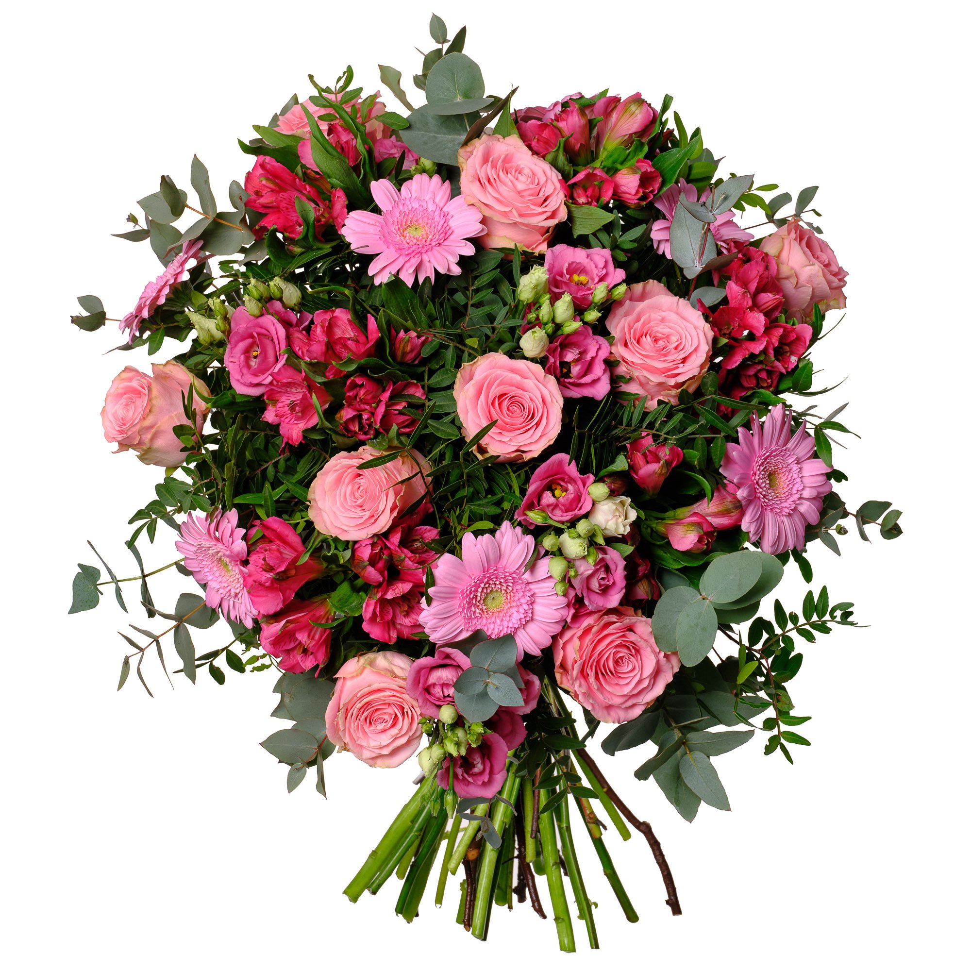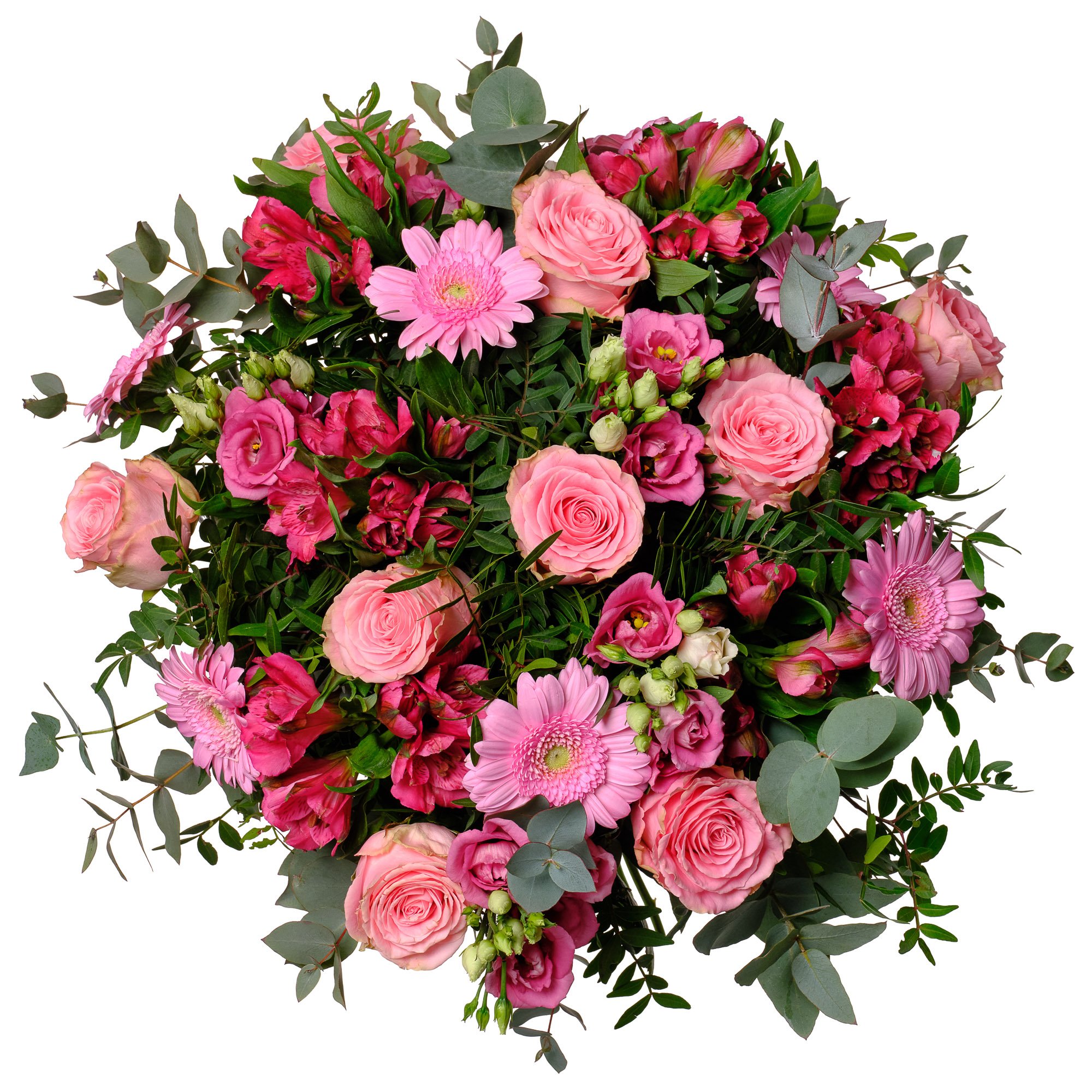 | Standardní | 3 ks růží, 2 ks eustoma, 4 ks alstromerie, 3 ks germína a dekorativní zeleň (pistacie, eukalyptus) |