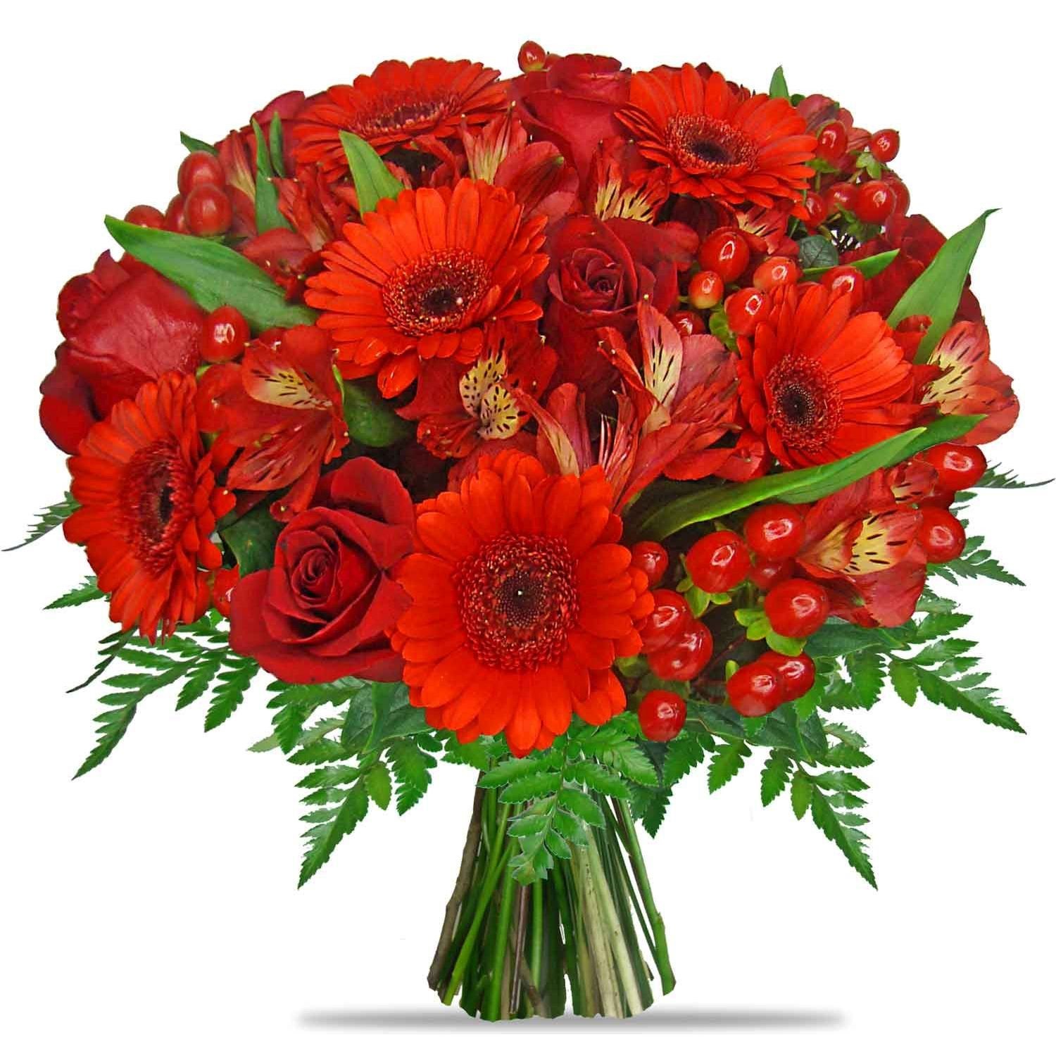 Velká 5 ks růže, 4 ks germinka, 3 ks alstromerie, 4 ks hypericum, okrasná zeleň