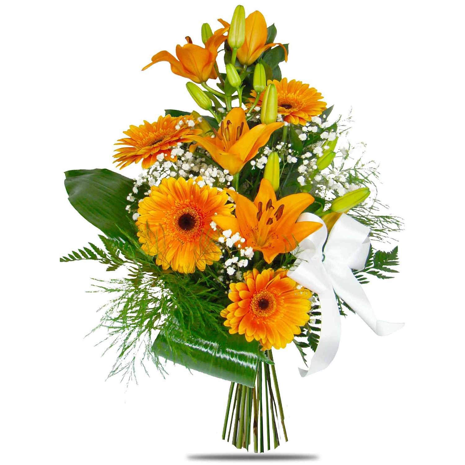 | Standardní | 1 ks lilie, 3 ks gerbera, 1 ks gypsophila, mašle a dekorativní zeleň (trefern, aspidistra, rumora) |