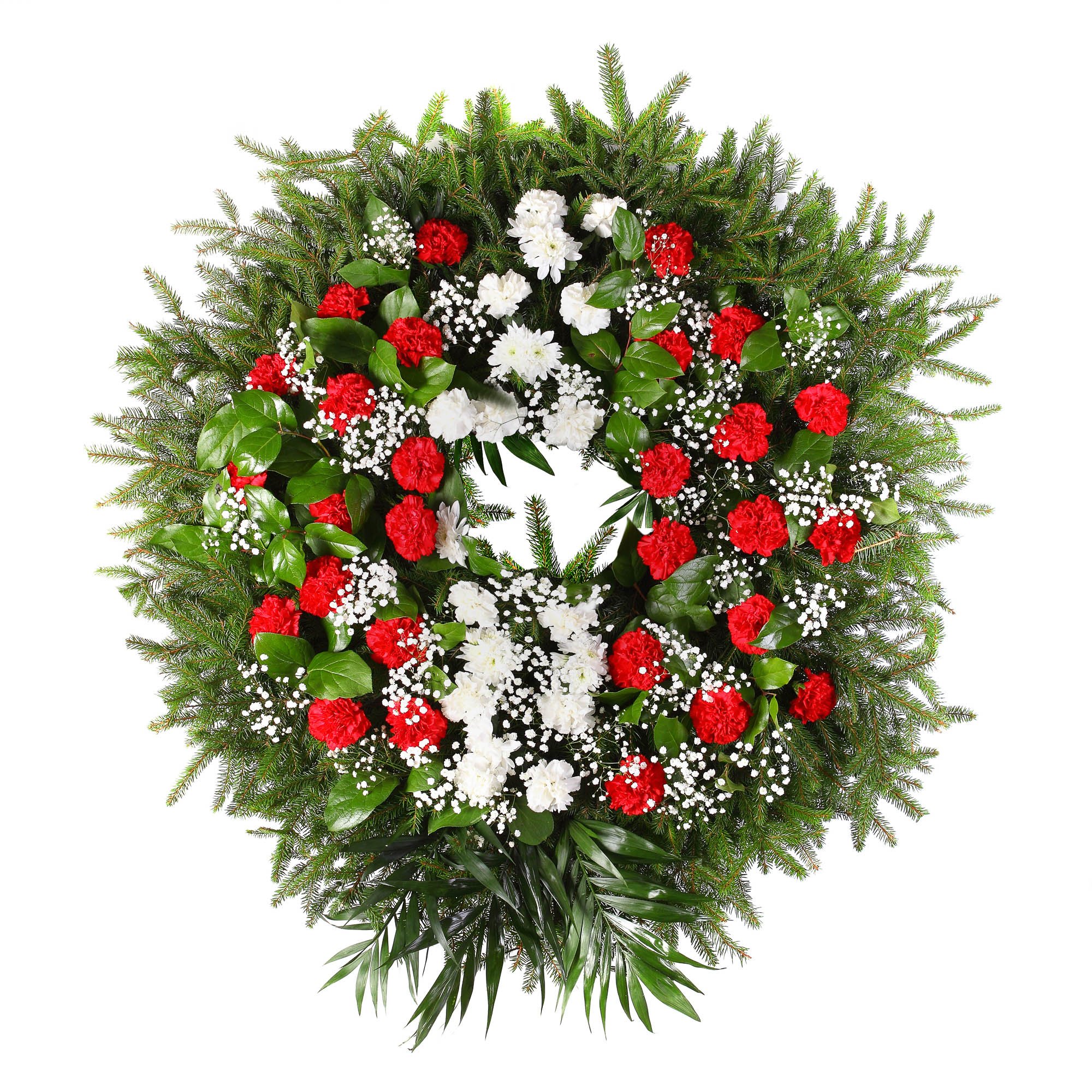 | Exkluzivní | 28 ks karafiáty, 8 ks gypsophila, 10 ks chryzantéma, dekorativní zeleň a smuteční stuha. Velikost cca. Ø 80 cm |