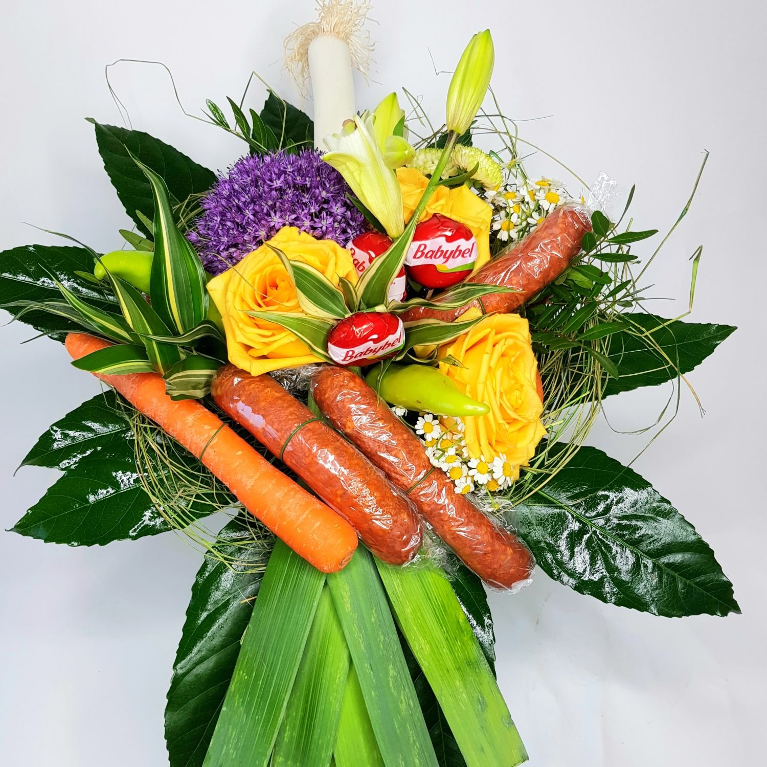 Klobásová kytice Ambrož je tvořena z klobás, sýrů, zeleniny a květů. Vše je doplněno okrasnou zelení.