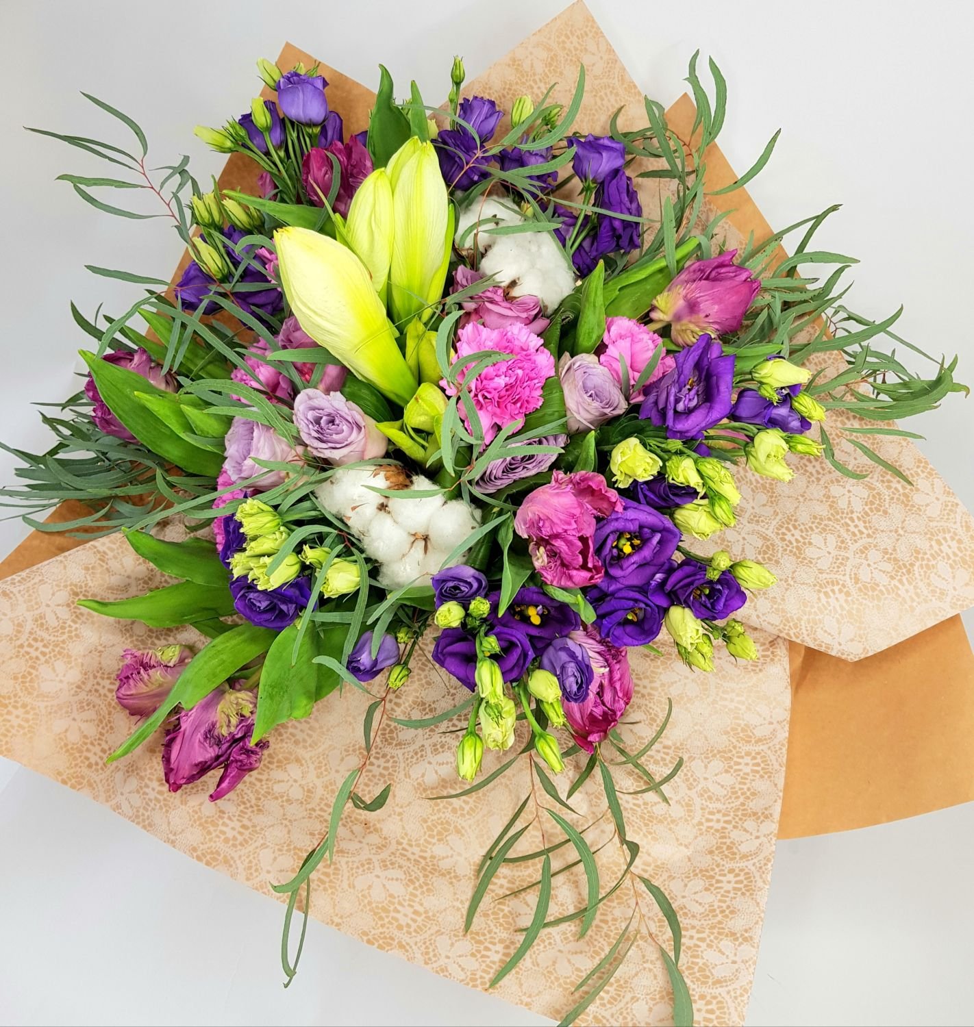 Dárková kytice Jindřiška je tvořena z bílého amarylisu, fialových tulipánů, fialové eustomy, fialových růží, fialových karafiátů a květy bavlníku. Vše je doplněno zelení a manžetou.