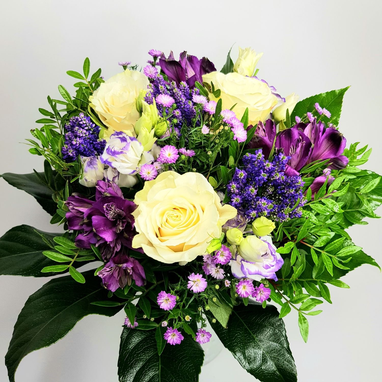 Kytice Jaroslava je tvořena z bílých růží, fialových alstromerií, astřiček, veroniky a eustomy. Květy jsou doplněné zelení.