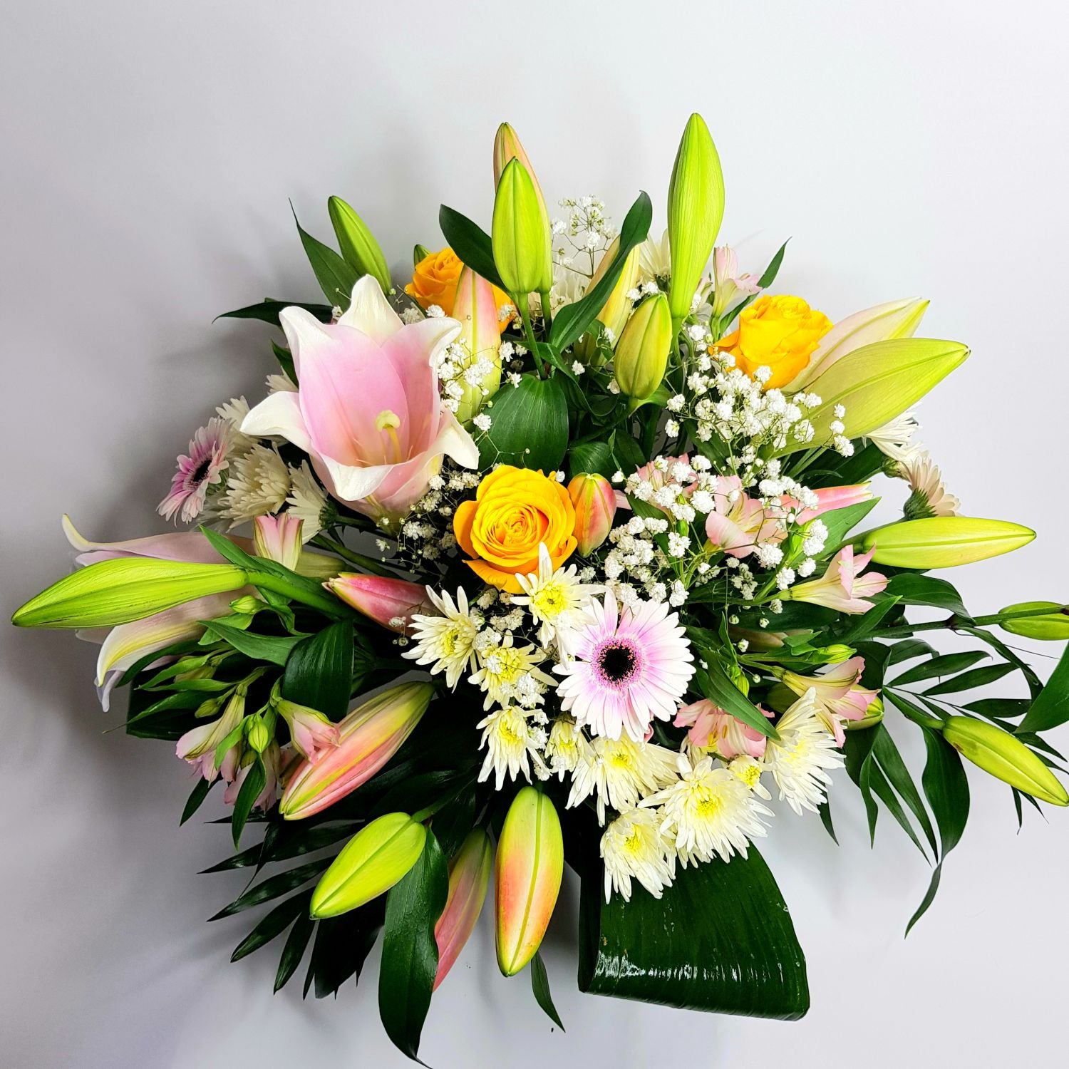 Aranžmá Ivona je tvořeno z růžových lilií, žlutých růží, bílých chrysanthém, růžových mini gerber, růžových alstromerií, gypsophilou a zelení. Květy jsou vypichovány do hmoty jménem Oasis, která je násáklá vodou a tak květiny dlouho vrdží. Vše je umístněné do okrasného obalu.