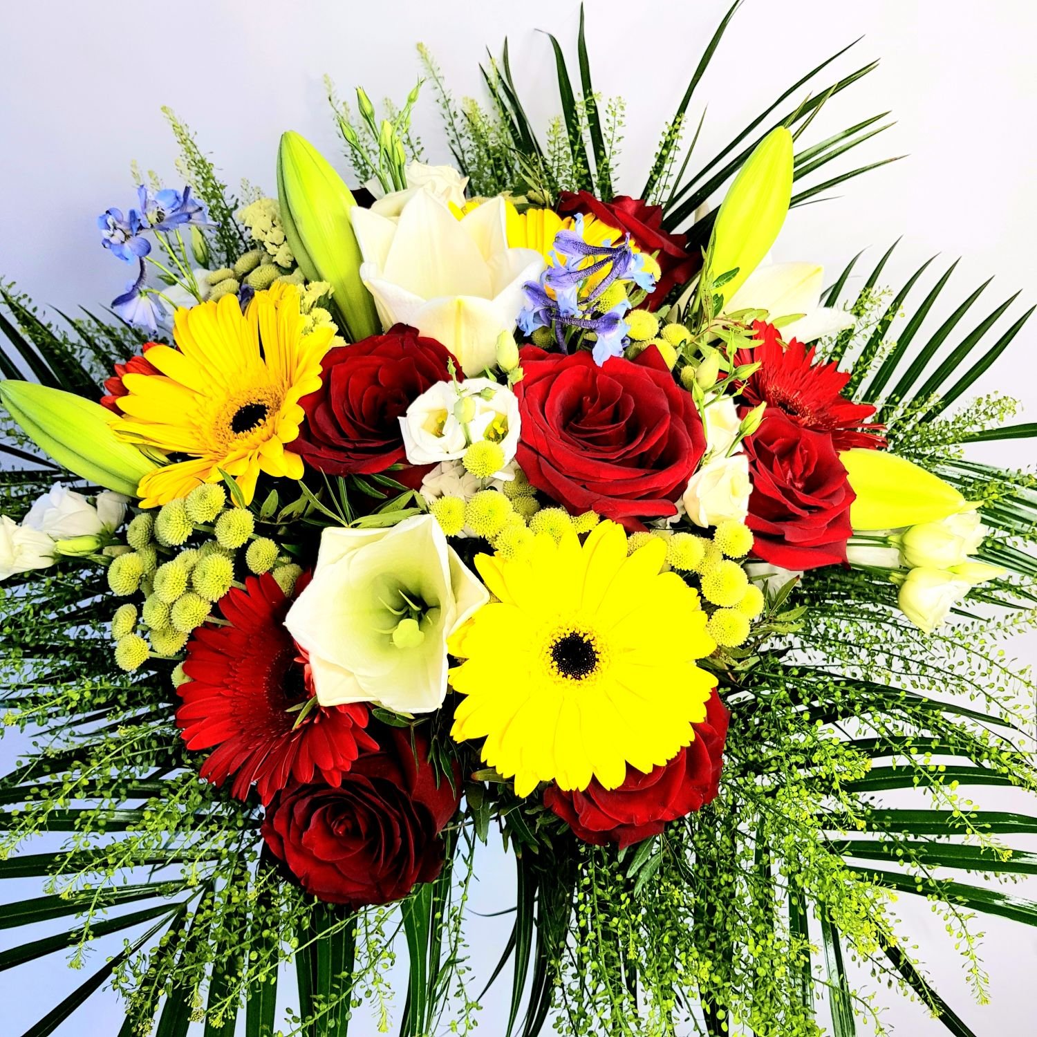 Kytice Ida je tvořena ze žlutých gerber, červených růží, bílých lilií a dále ze žlutého heřmánku a bílé eustomy. Květy jsou doplněné zelení.