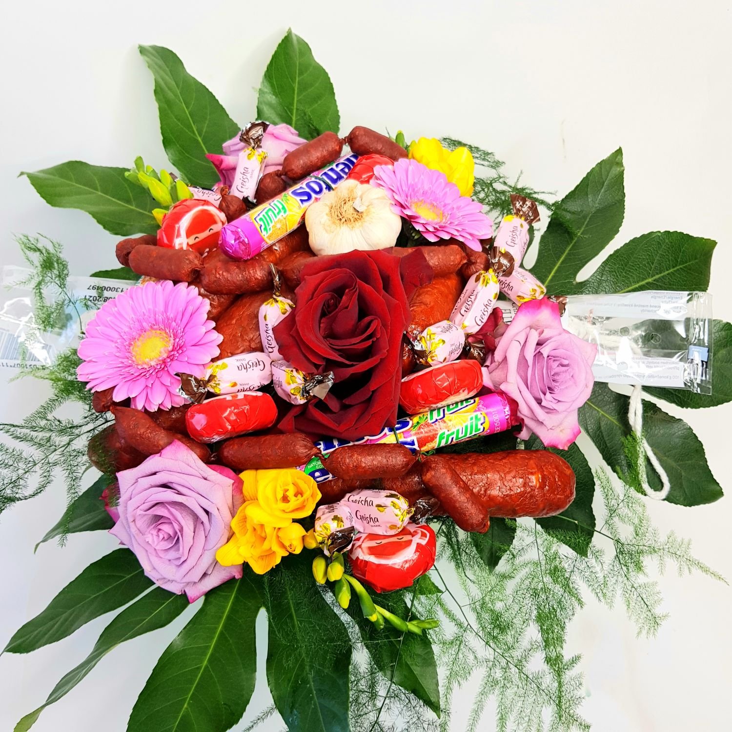 Kytice Václav je tvořena klobás, sýru, bonbónů dále z květů a doplňkové zeleně.