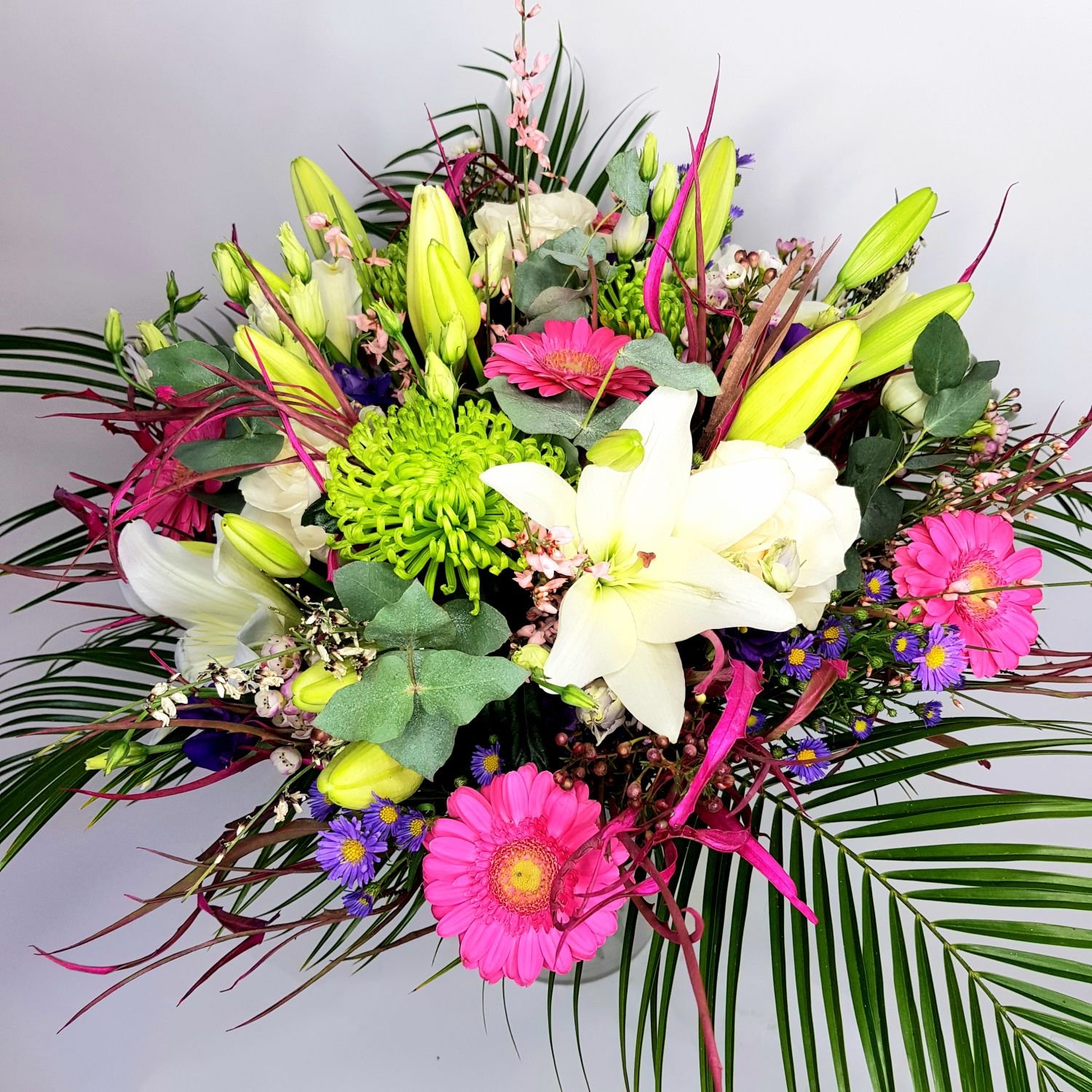 Kytice Martina je tvořena z bílých lilií, bílé eustomy, růžových gerber, zelených chrysanthém, fialovou astřičkou, bílých růží a dekorativní zelení.