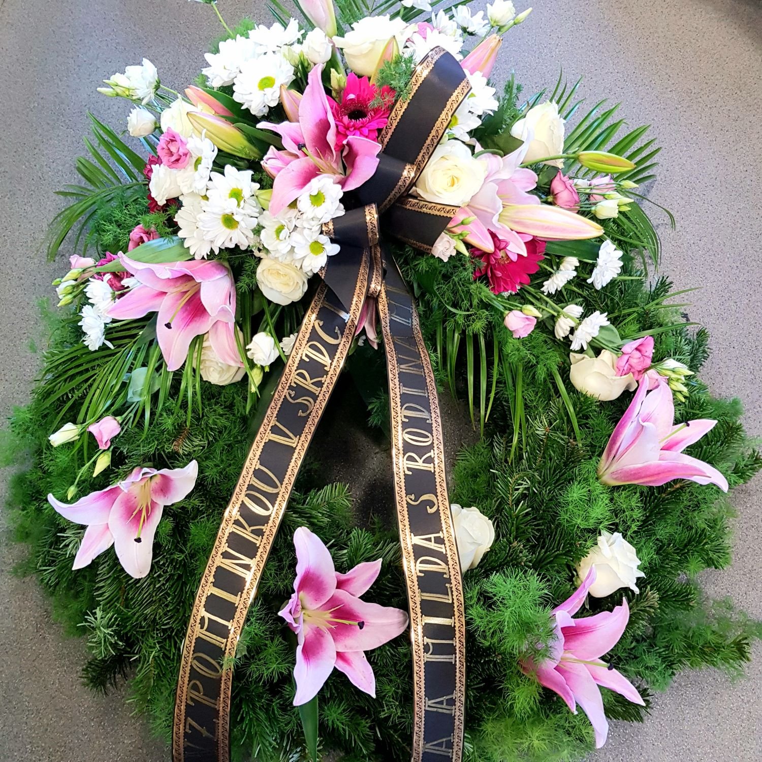 Smuteční věnec číslo 46. je tvořen z růžových lilií, bílých chrysanthém, bílých růží, růžových gerber a růžové eustomy. Květy jsou doplněné zelení a stuhou s nápisem dle Vašeho přání. Květy jsou vypichované do speciálního držáku, který je nasáklý vodou a proto květy dlouho vydrží. Průměr věnce je 70cm.