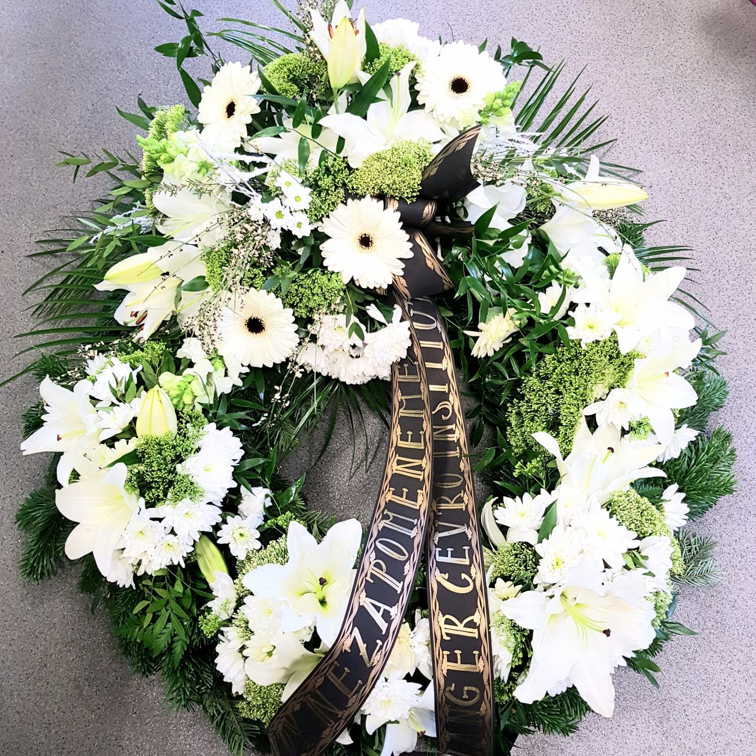 Smuteční věnec číslo 32. je tvořen z chvojí a z bílých květů chrysanhém, gerber, lilií, trachelia. Květy jsou vypichovány do hmoty, která je nasáklá vodou a proto květy dlouho vydřží. Na smuteční stuhu Vám napíšeme text dle Vašeho přání. Tento věnec má průměr 70cm.