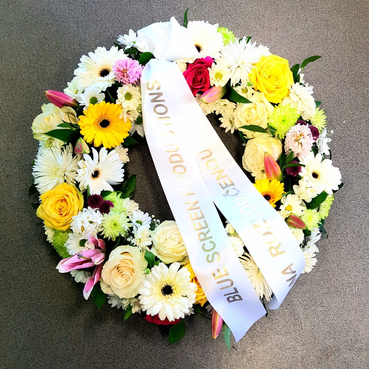 Smuteční věnec vypichovaný číslo 18. je tvořen z bílých a žlutých gerber, bílých a zelených chrysanthém dále zrůžových lilií, bílých růžích a doplňkovou zelení a stuhou s nápisem dle Vašeho přání. Květy jsou vypichované do hmoty, která je nasáklá vodou a proto dlouho vydrží jelikož mají stálý přísun vody. Tento smuteční věnec má průměr 50cm.