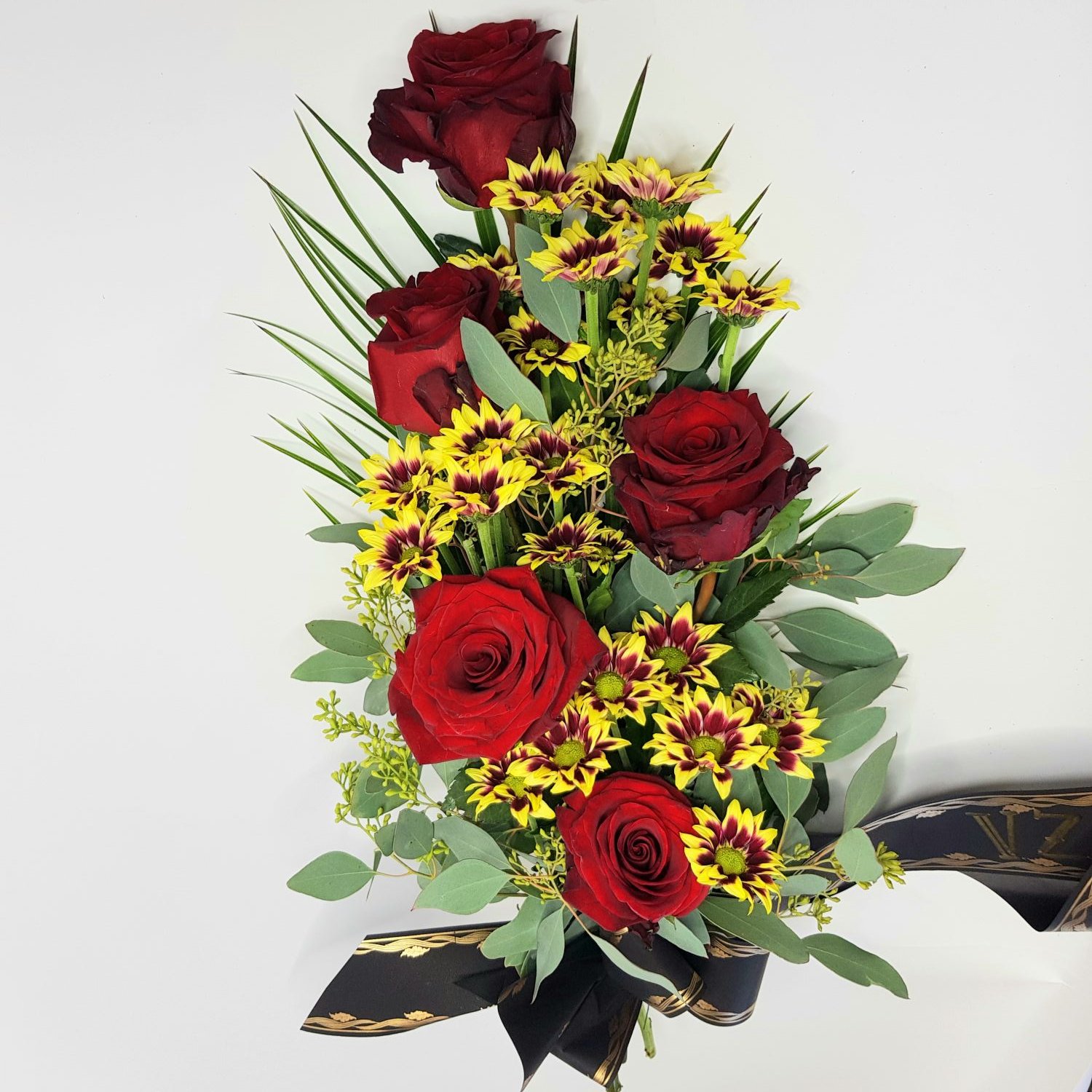 Smuteční kytice vázaná 1 je tvořena z červených růží a tmavě žlutých chrysanthém, doplňkovou zelení a černou stuhou s nápisem podle Vašeho přání.