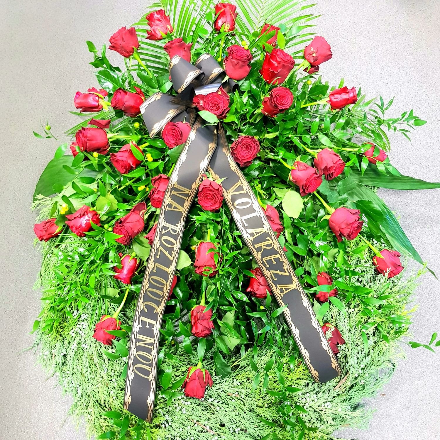 Smuteční věnec číslo 2. je tvořen z chvojí a ze 40ti červených růží, které jsou doplněné zelení. Na smuteční stuhu Vám napíšeme text dle Vašeho přánní. Tento věnec má průměr 70cm