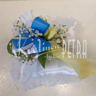 Polštářek na snubní prstýnky číslo 18. je tvořen z dekorativního polštářku, který je doplněn květy , které jsou lepené speciálním lepidlem na živé květy . Květy jsou pak postříkané speciálním sprejem proti vypařování vody. Pro udržení snubních prstýnků jsou v polštářku zapíchnuté dva špendlíky s okrasnou hlavičkou.
