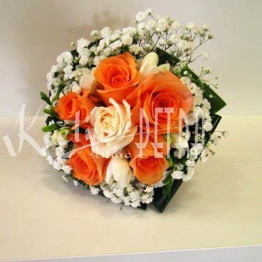 Svatební kytice pro svědkyni nebo maminku číslo 14. je tvořena z oranžových a krémových růží, které jsou doplněné gypsophilou a zelení. Kytice pro svědkyni či matky se vždy odvíjejí od svatební kytice.