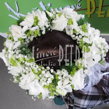 Květinový věneček číslo 4. je tvořen ze živých květů, které jsou zafixované speciálním postřikem proti vypařování vody. Tato květinová dekorace do vlasů se hodí pro nevěsty, které mají obřad např. na louce a nebo pro družičky. Květy, které se do věnečku dávají mají být stejné jako jsou květy např. ve svatební kytici či ve svatební dekoraci.