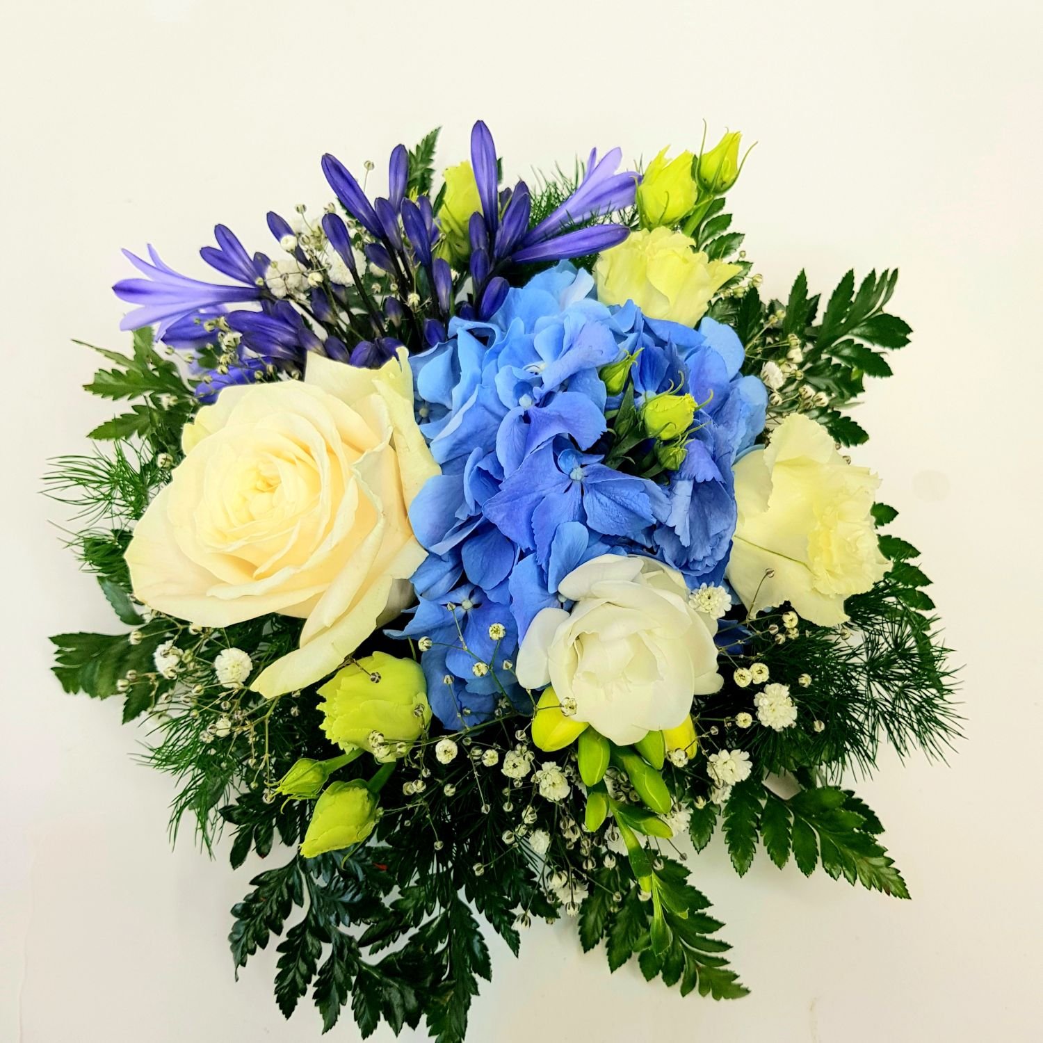 Svatební kytice pro svědkyni nebo maminku číslo 8. je tvořena z bílých růží, bílé fresie, krémové eustomy, modré hortenzie, bílé gypsophily a zeleně. V kytici by měli být květy stejné jako jsou ve svatební květině.