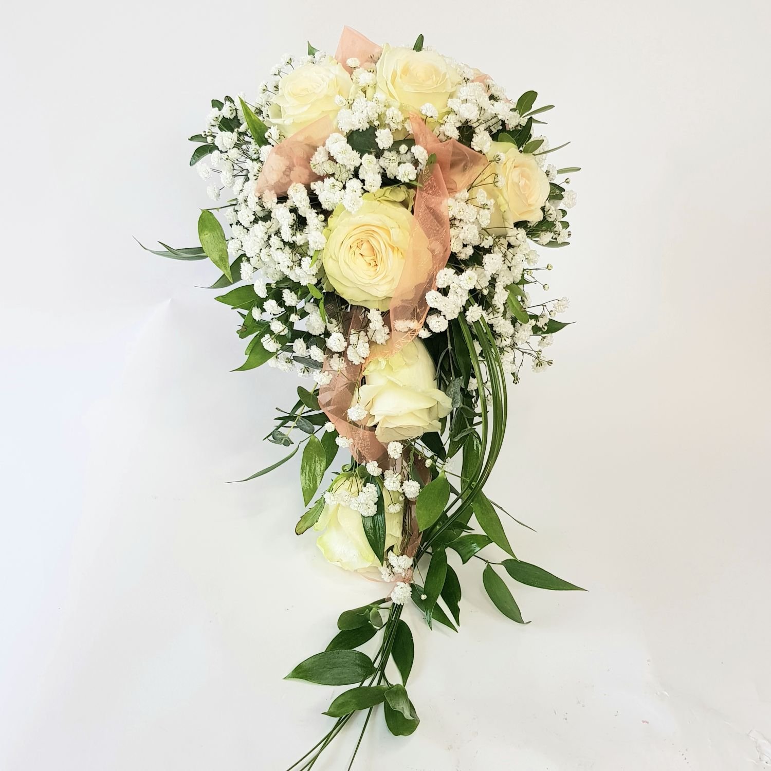 Svatební kytice převislá číslo 453. je tvořena z bílých růží, gypsohilly a zeleně. Květy jsou doplněné růžovou organsou.