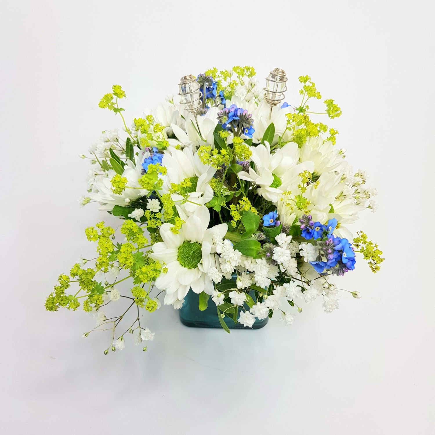 Dekorace na snubní prstýnky katalogové číslo 8. je tvořen z bílých chrysanthém, modrých pomněnek, alchimilou a dekorativním špendlíkem. Skladba květin je vždy stejná jako je svatební kytice.