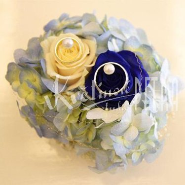Dekorace na snubní prstýnky číslo 4. je tvořena z bílé a modré růže, které jsou doplněny modrou hortenzií. Tato dekorace se vždy aranžuje z květin, které jsou ve svatební kytici.