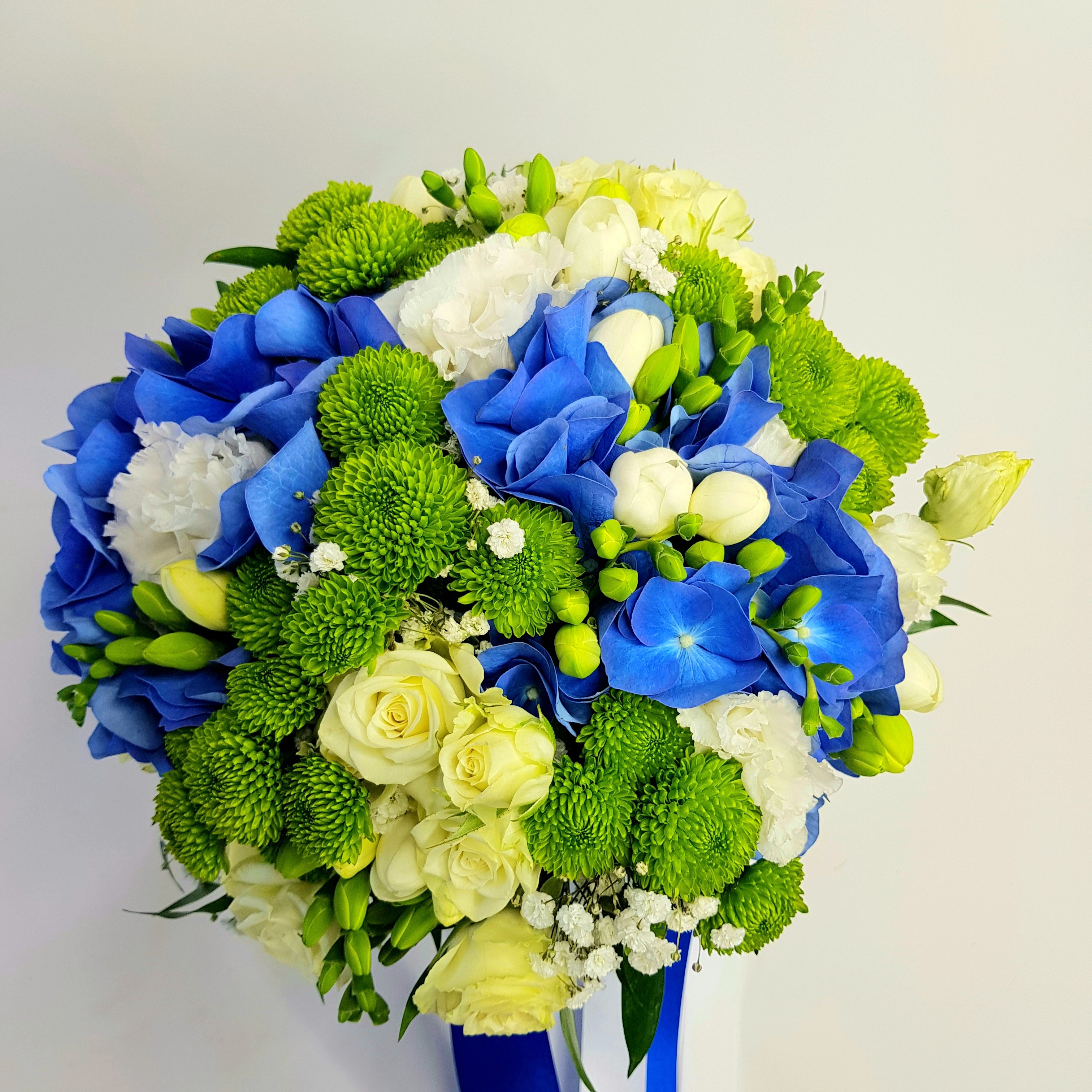 Svatební kytice číslo 408. je tvořena z modré hortenzie, bílých růží, zelených chrysanthém, bílé eustomy, bílých fresií. Květy jsou doplněné gypsophyllou, zelení a stuhou.