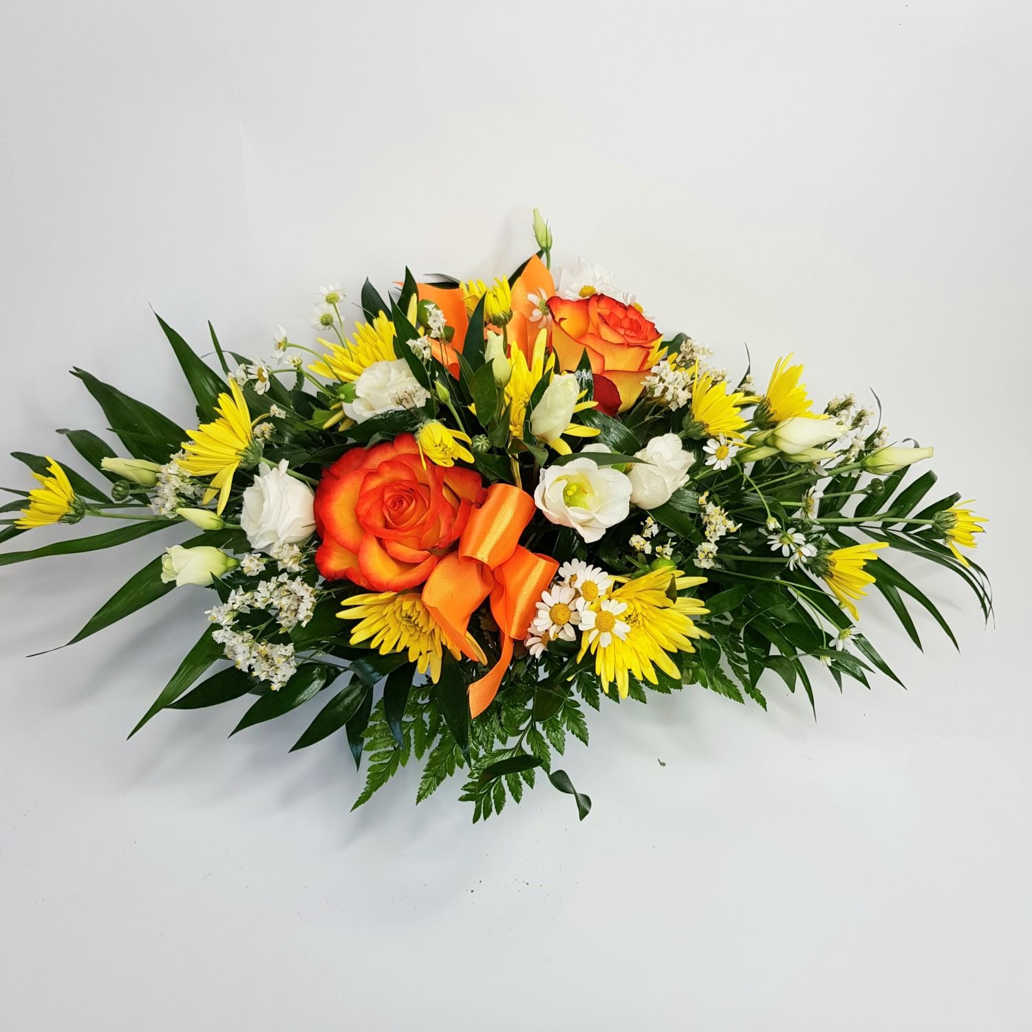 Aranžmá na stůl číslo 49. je tvořeno z oranžových růží, žlutých chrysanthém, heřmánku, bílé eustomy, žlutým limoniem, dekorativní stuhou a zelení. Toto aranžmá je vypichované do aranžovací misky kam se dolévá voda.