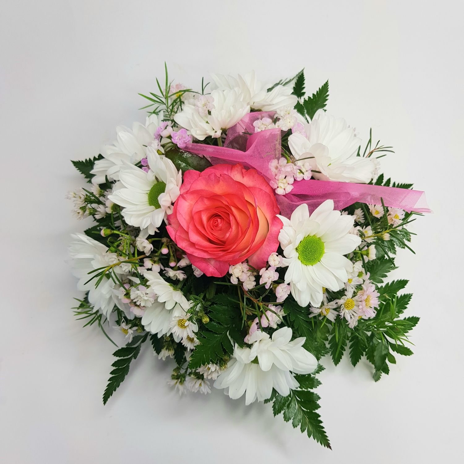 Aranžmá na stoly číslo 7. je tvořeno z růžové růže, bílé chrysanthémky, růžové astřičky, růžového waxu, zelení a stuhou.