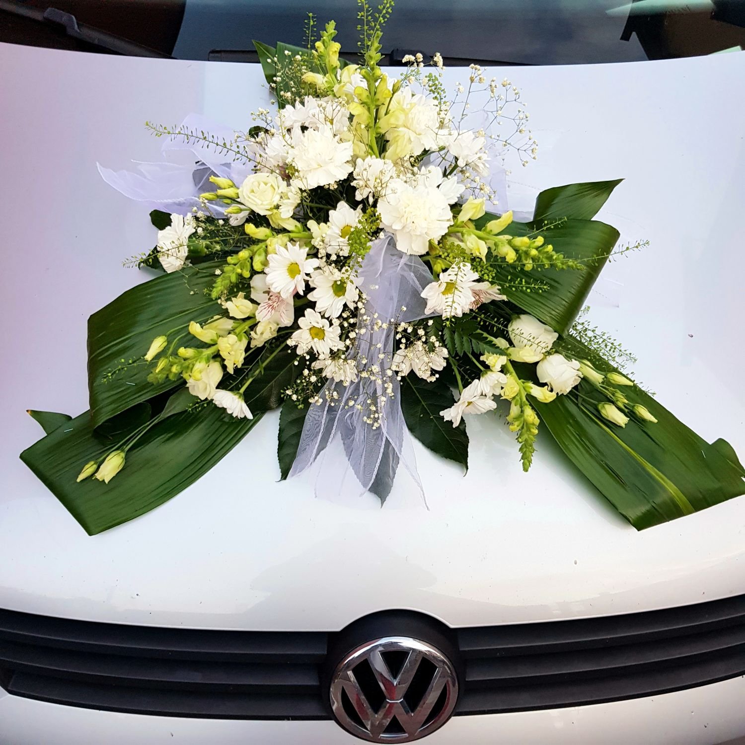 Aranžmá na auto číslo 19. je vytvořeno z bílé mathioly, bílých chrysanthém, bílé eustomy, bílých karafiátů, stuhou a doplňkovou zelení. Vše je naaranžované do hmoty, která je nasáklá vodou a proto déle vydrží. Aranžmá na kapotě auta drží díky přísavce.