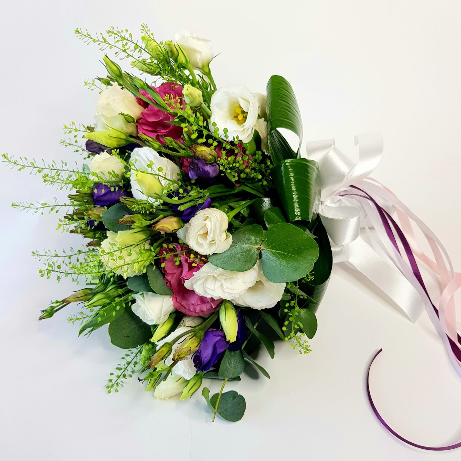 Svatební kytice číslo 351. je tvořena z různobarevných eustom, které jsou doplněné zelení a stuhou