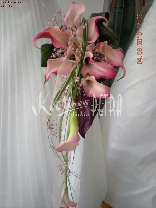 Svatební kytice převislá se hodí k jednodušším svatebním šatům a k vyšší nevěstě. Tato svatební kytice je tvořene z růžových kall a doplněna růžovou gypsophilou a doplňkovou zelení, která ladí barevně s celou kyticí.