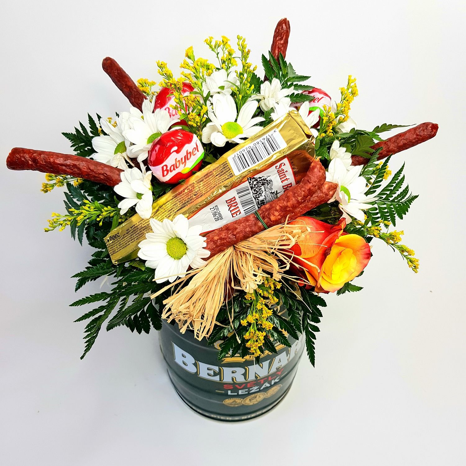 Květinové aranžmá pro pány Bernard je tvořeno z 5l soudku piva značky Bernard, který je přizdoben klobáskami, sýry, květy a zelení. Tento produkt prosím objednávejte alespoň dva dny před datem doručení či vyzvednutí.