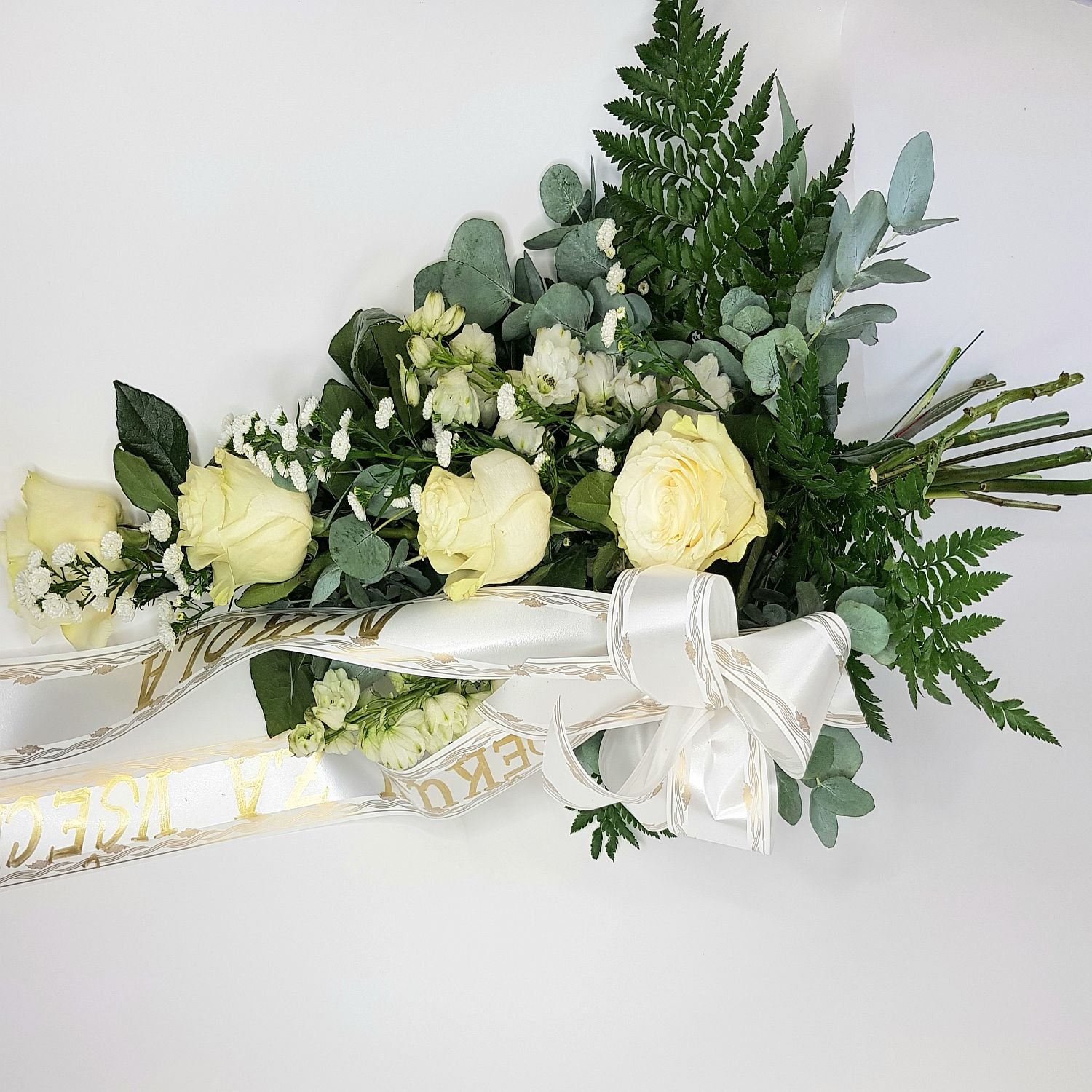 Smuteční kytice vázaná v ruce číslo 17. je tvořena z bílých růží, které jsou doplněné bílými květy, zelení a smuteční stuhou s nápisem dle Vašeho přání.