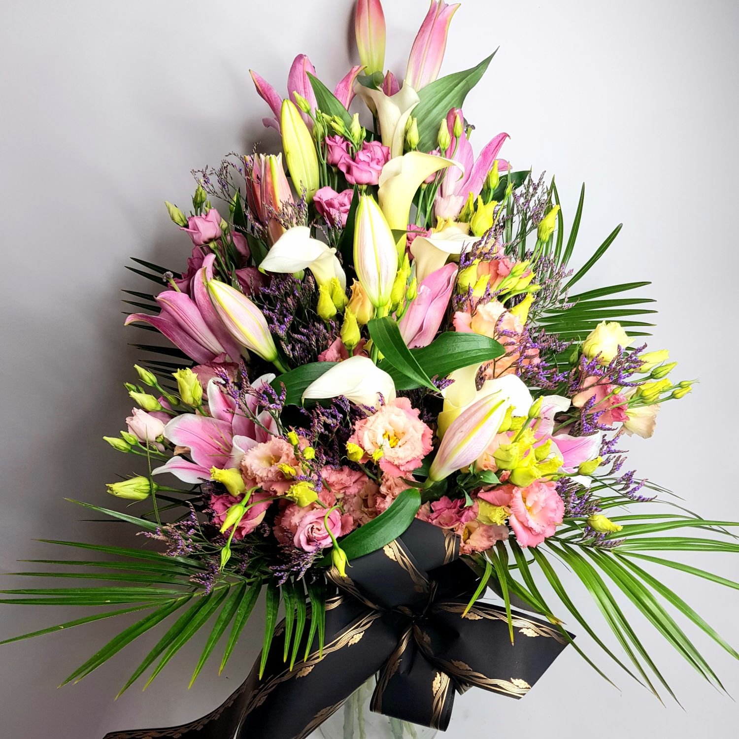 Smuteční kytice vázaná č. 19 je tvořena z růžových lilií, růžových eustom, bílých kal a fialového limonia. Květy jsou doplněné zelení a sluteční stuhou s textem dle Vašeho přání.