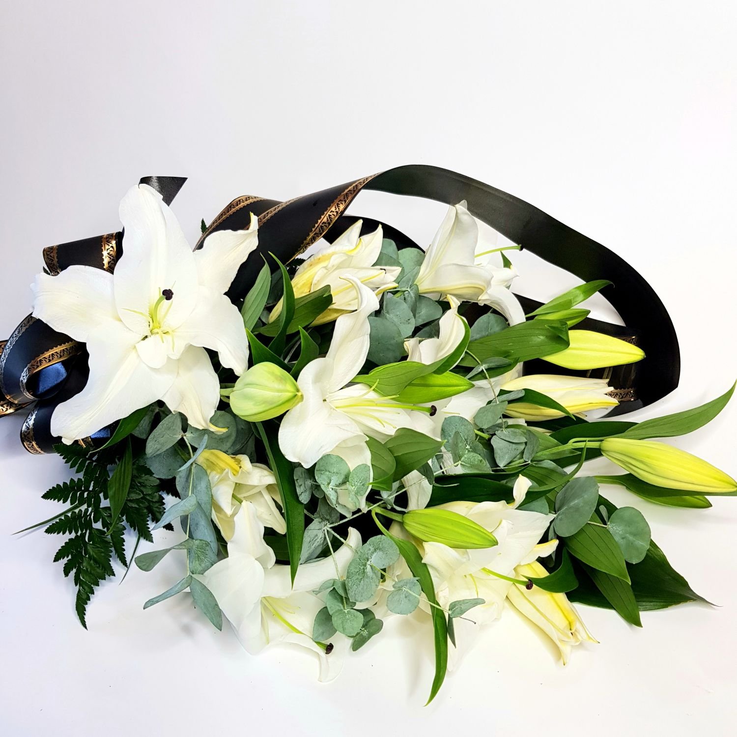 Smuteční kytice vázaná č. 29 je tvořena z 6ti bílých lilií, které jsou doplněné eukalipthem a smuteční stuhou s nápisem dle Vašeho přání.