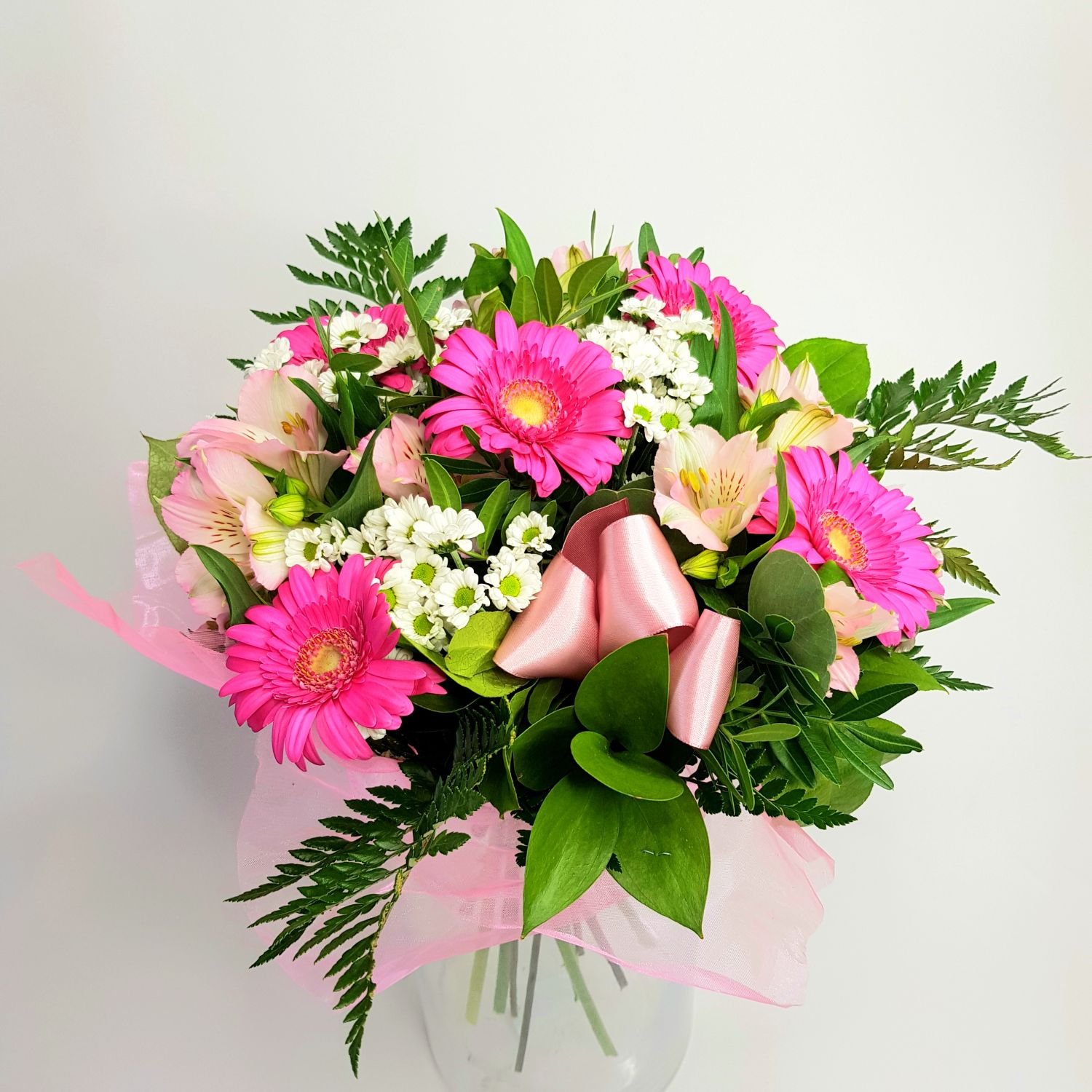 Kytice Květoslava je tvořena z růžových mini gerber, bílých chrysanthém a růžových alstromerií. Květy jsou doplněné stuhou, manžetou a zelení.