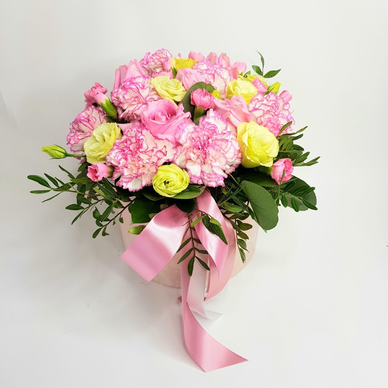 Květinový box Maxima je tvořen z růžových karafiátů a mini karafiátů, světlé eutomy, růžových růží a zeleně. Vše naaranžované do okrasného boxu kde se nachází hmota, která je nasáklá vodou a proto květy dlouho vydrží.
