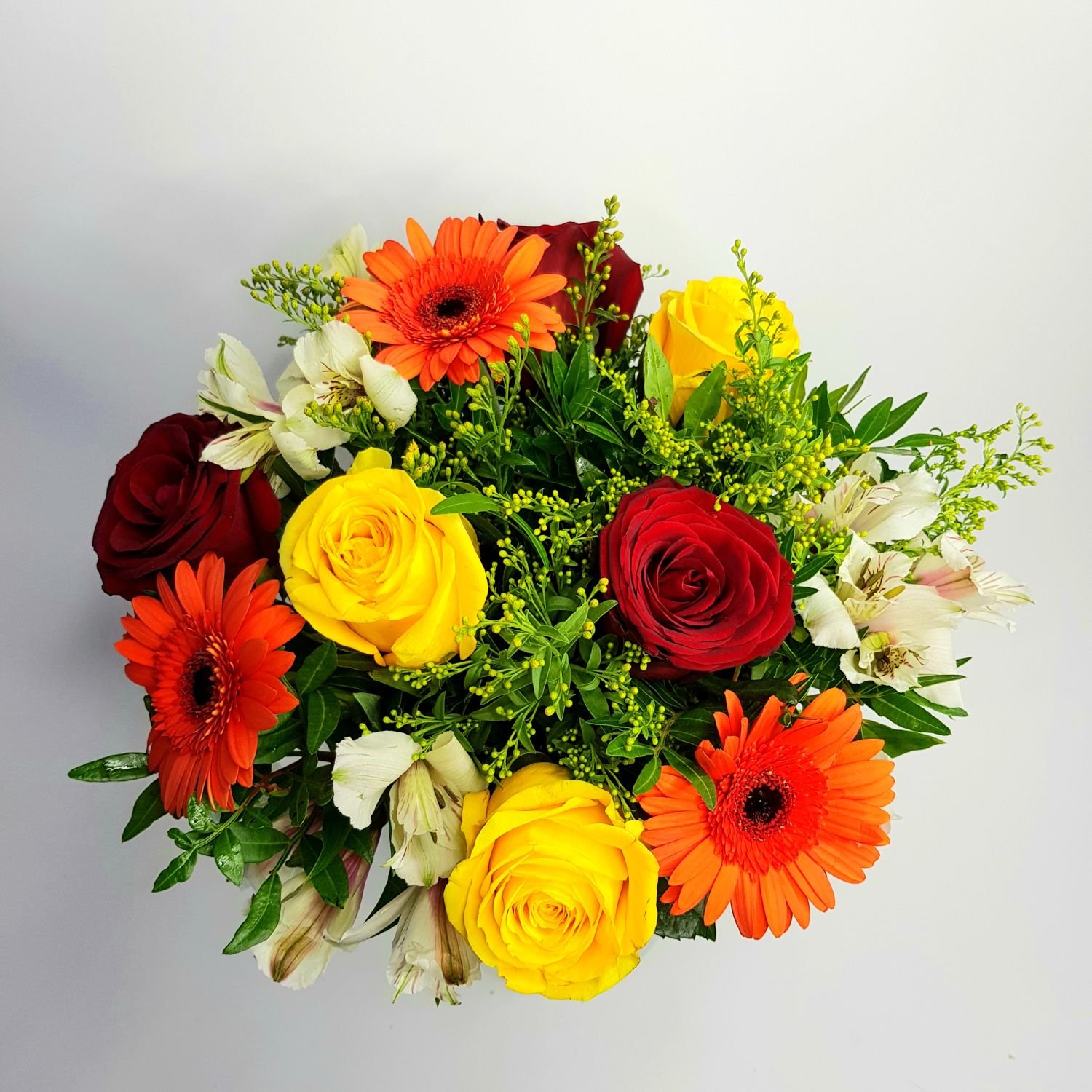 Kytice Veronika je tvořena z červených a žlutých růží, oranžových mini gerber, solidagem, alstromeií a zelení.
