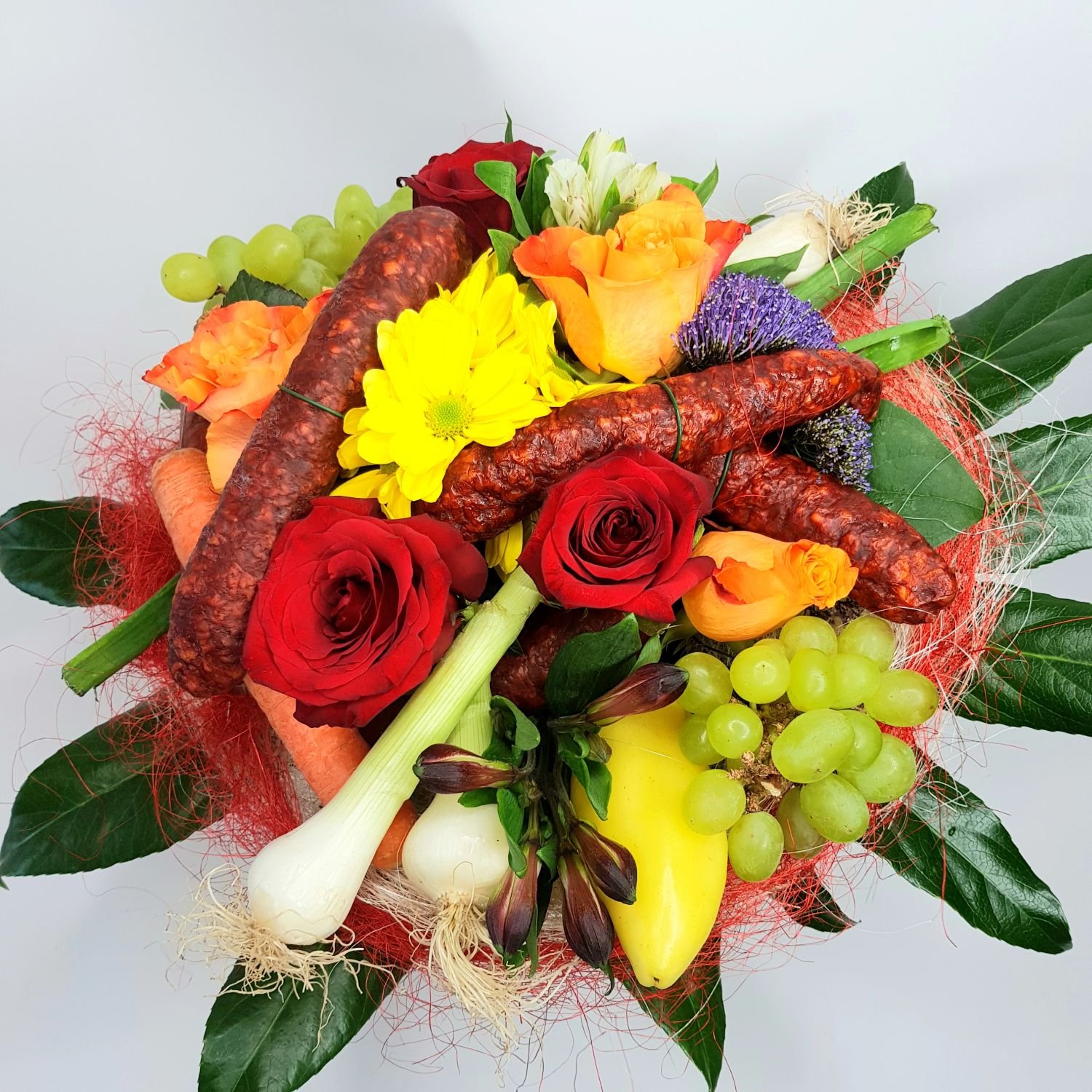 Kytice Aleš je tvořena z klobás, hroznového vína, zeleniny a z květů. Vše je doplněno dekorativní zelení.