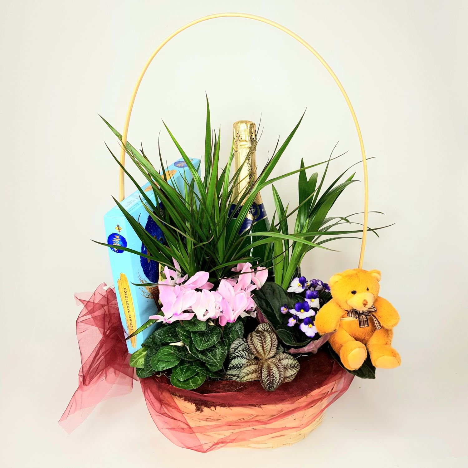 Dárkový koš Donáta je tvořen z hrnkových rostlin, bonboniéry, lahví Bohemia sekt a plyšovým medvídkem. Vše je naaranžované do proutěného koše a ozdobené stuhou.
