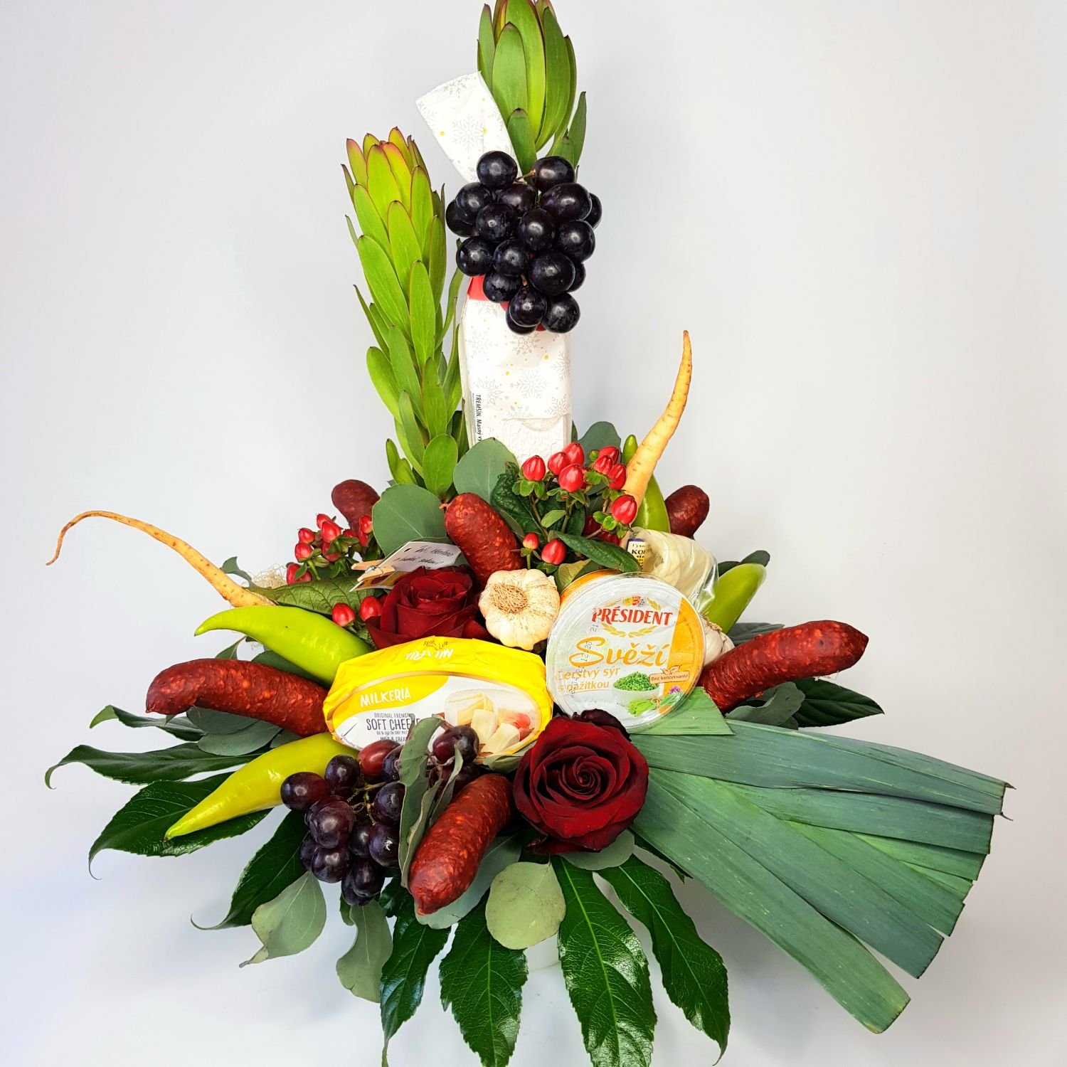 Aranžmá Tomáš je tvořeno z klobás, zeleniny, sýrů dále z květů a doplňkové zeleně. Vše je naaranžované do okrasného obalu.