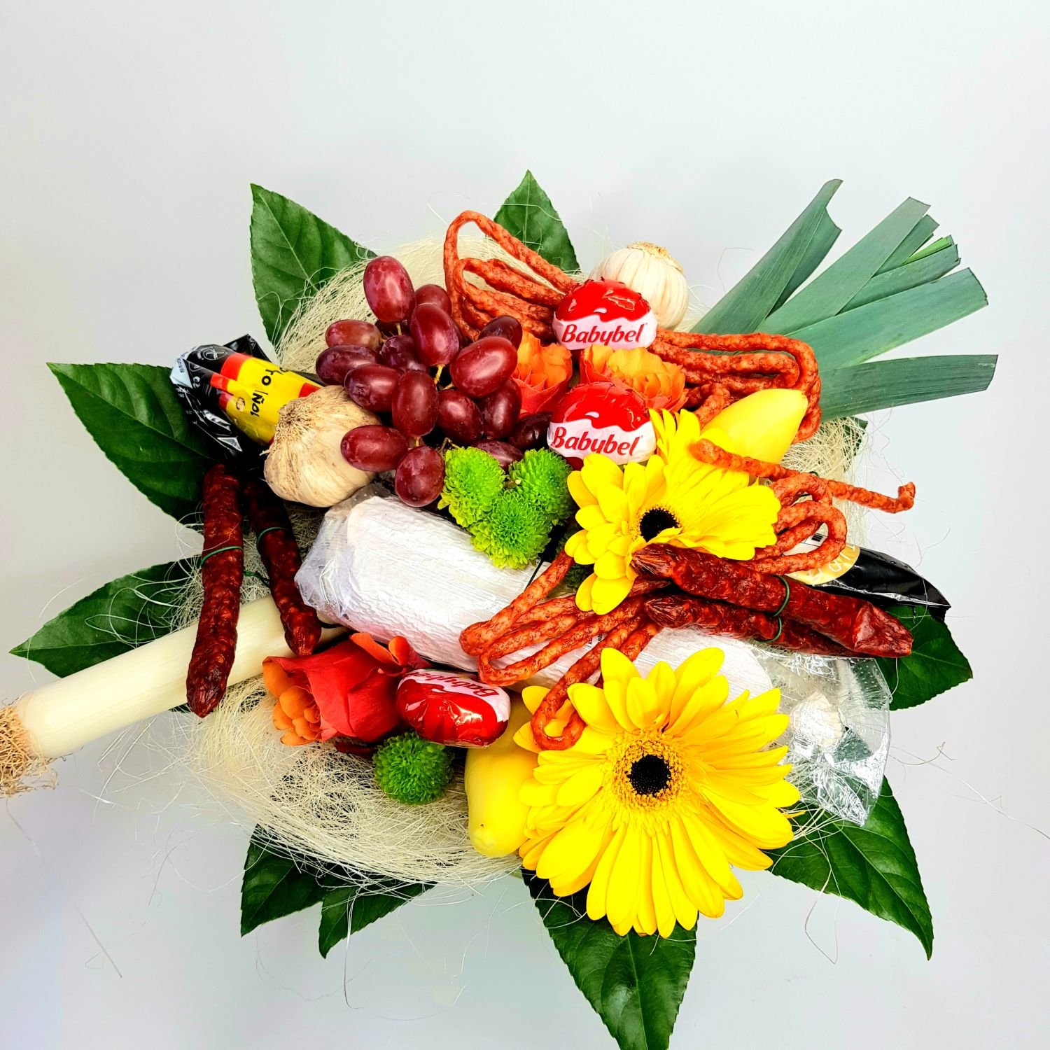 Kytice Bohumil je tvořena z květů, klobás ze sýrů, zeleniny a hroznového vína. Vše je doplněno okrasnou zelení. Tato kytice je vhodná nejen pro pány, ale pro všechny co mají rádi klobásky.