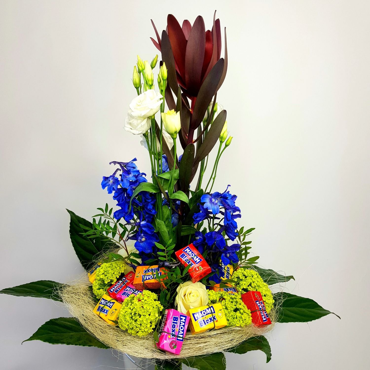 Kytice Milan je tvořena z leucadendronu, bílé eustomy, modrého delphinia, viburnem nebo zelenou chrysanthémkou, bonbóny a zelení.