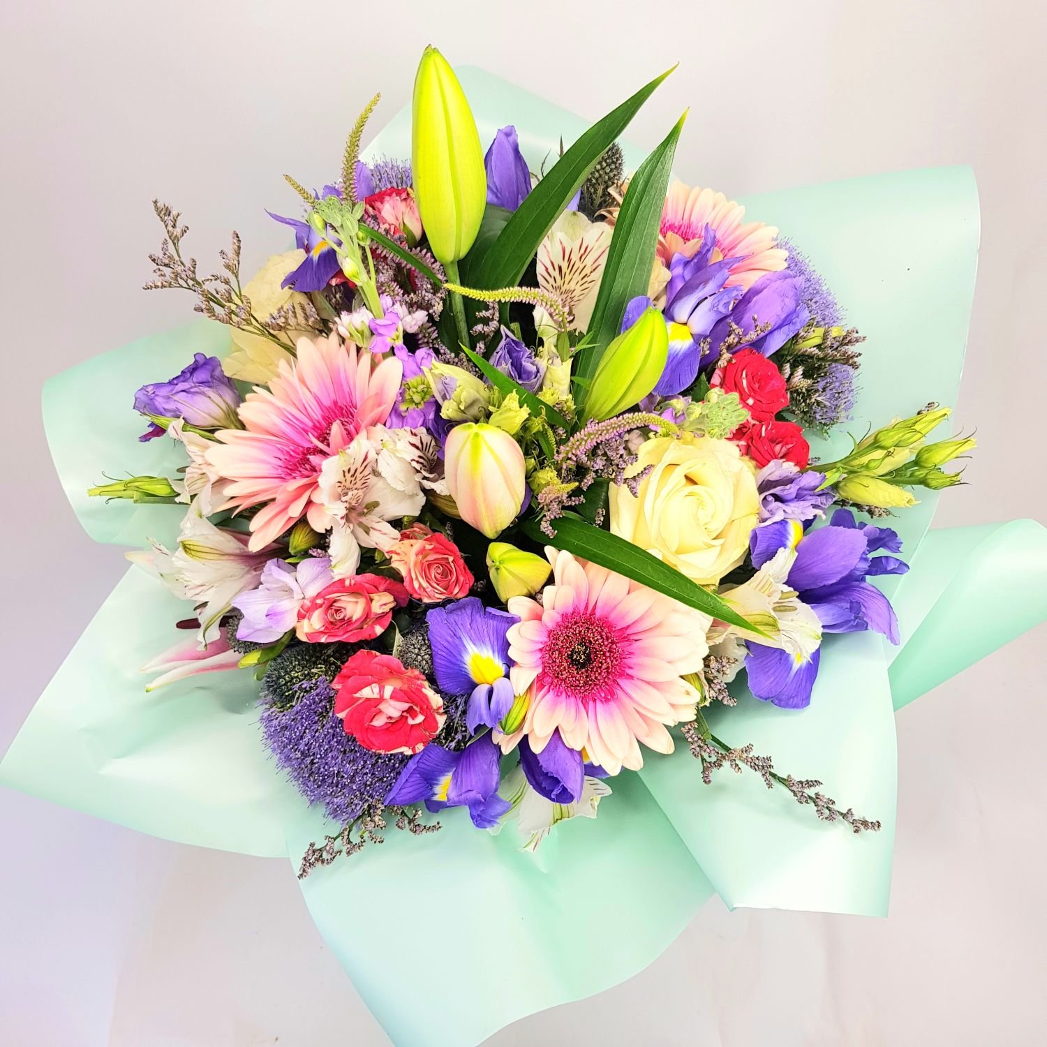 Kytice Laura je tvořena z růžové lilie, růžových gerber, modrých irisů, fialového trachelia, růžových trsových růží, bílé alstromerie a fialkovým limoniem. Květy jsou doplněné zelení a manžetou