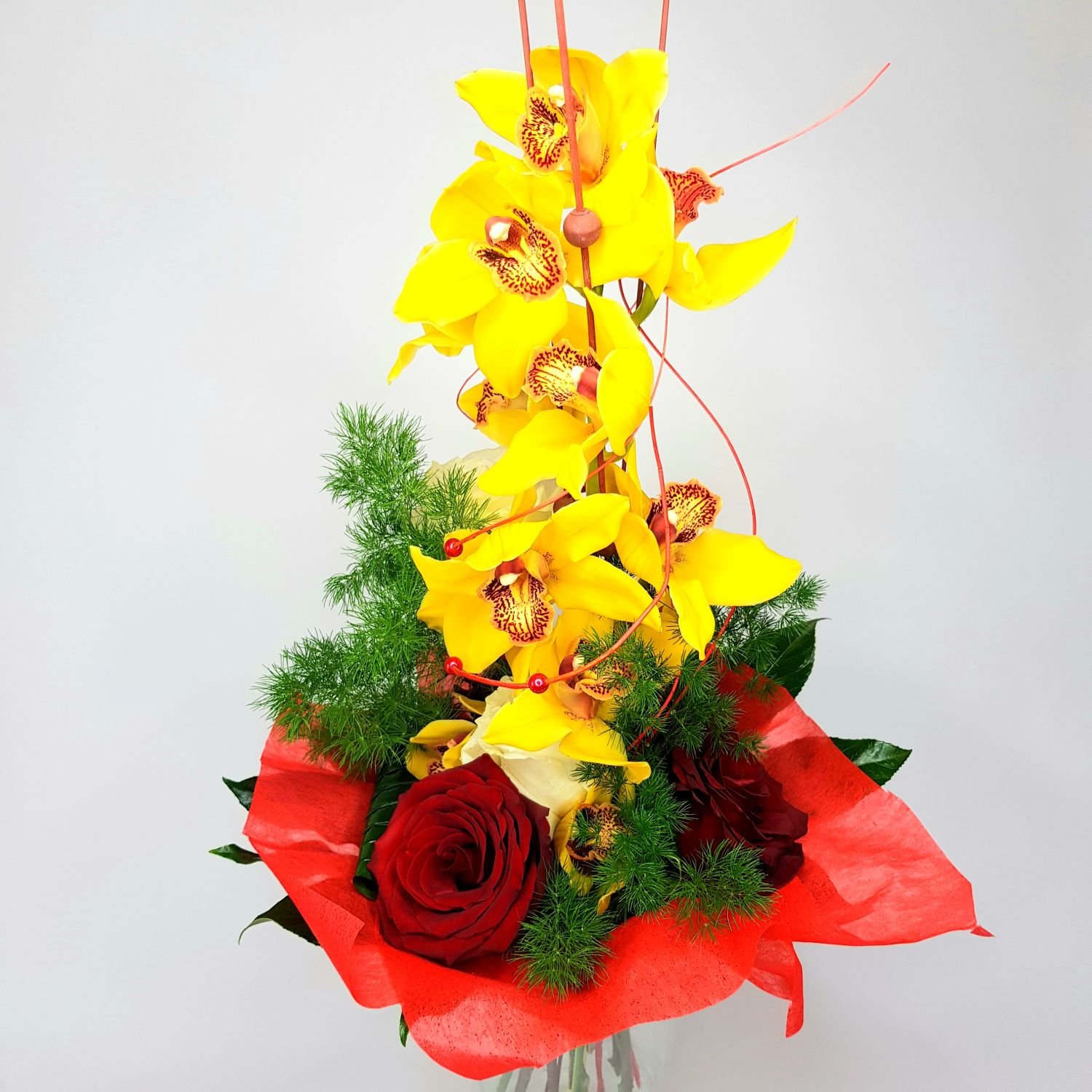 Kytice Věra je tvořena z orichideje cymbidium z červených růží a bílých růží. Květy jsou přizdobené sušinou, zelení a manžetou.