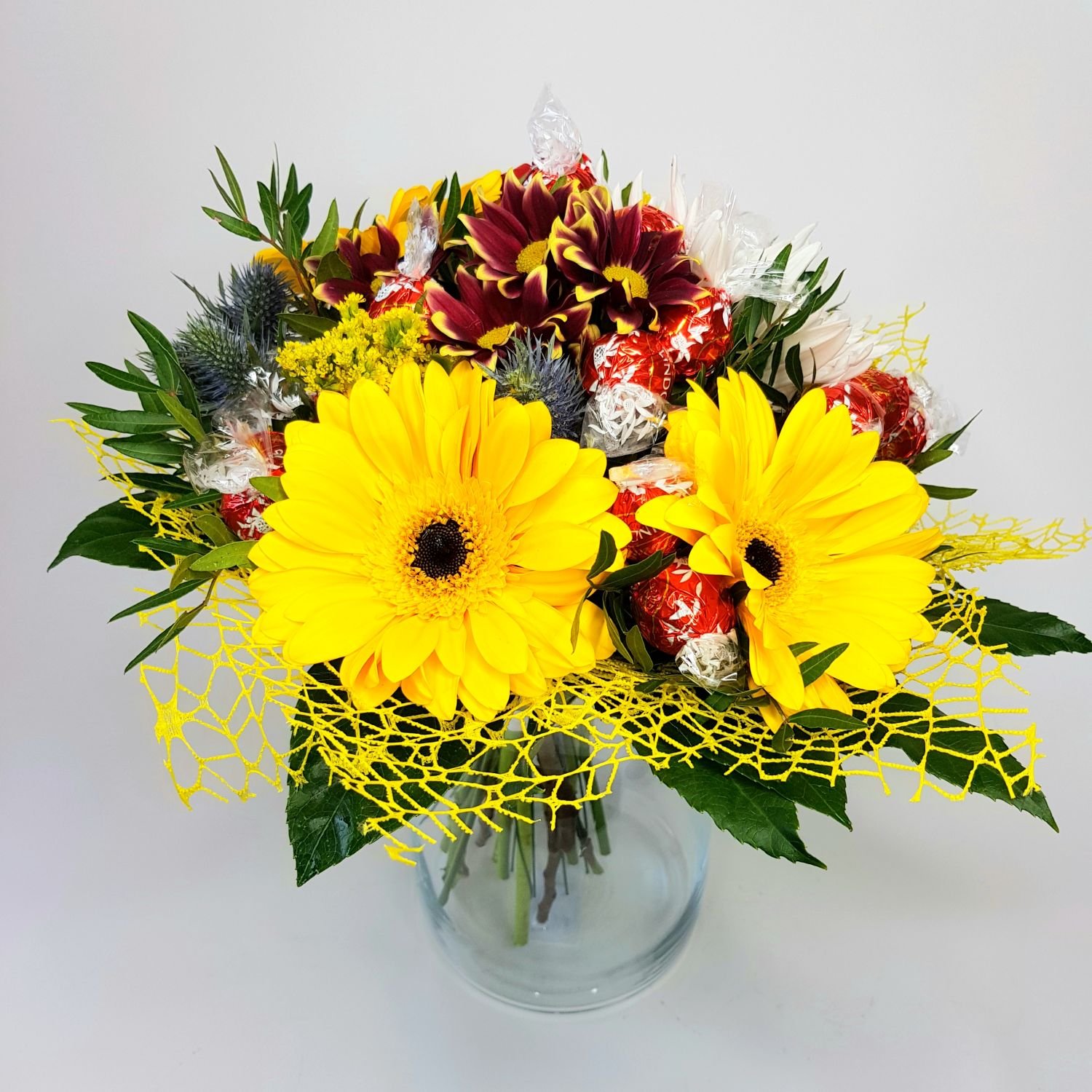 Kytice Marcela je tvořena z bonbónů, ze žlutých gerber, chrysanthémky, erngína a solidagem. Kytice je doplněná okrasnou manžetou a zelení.