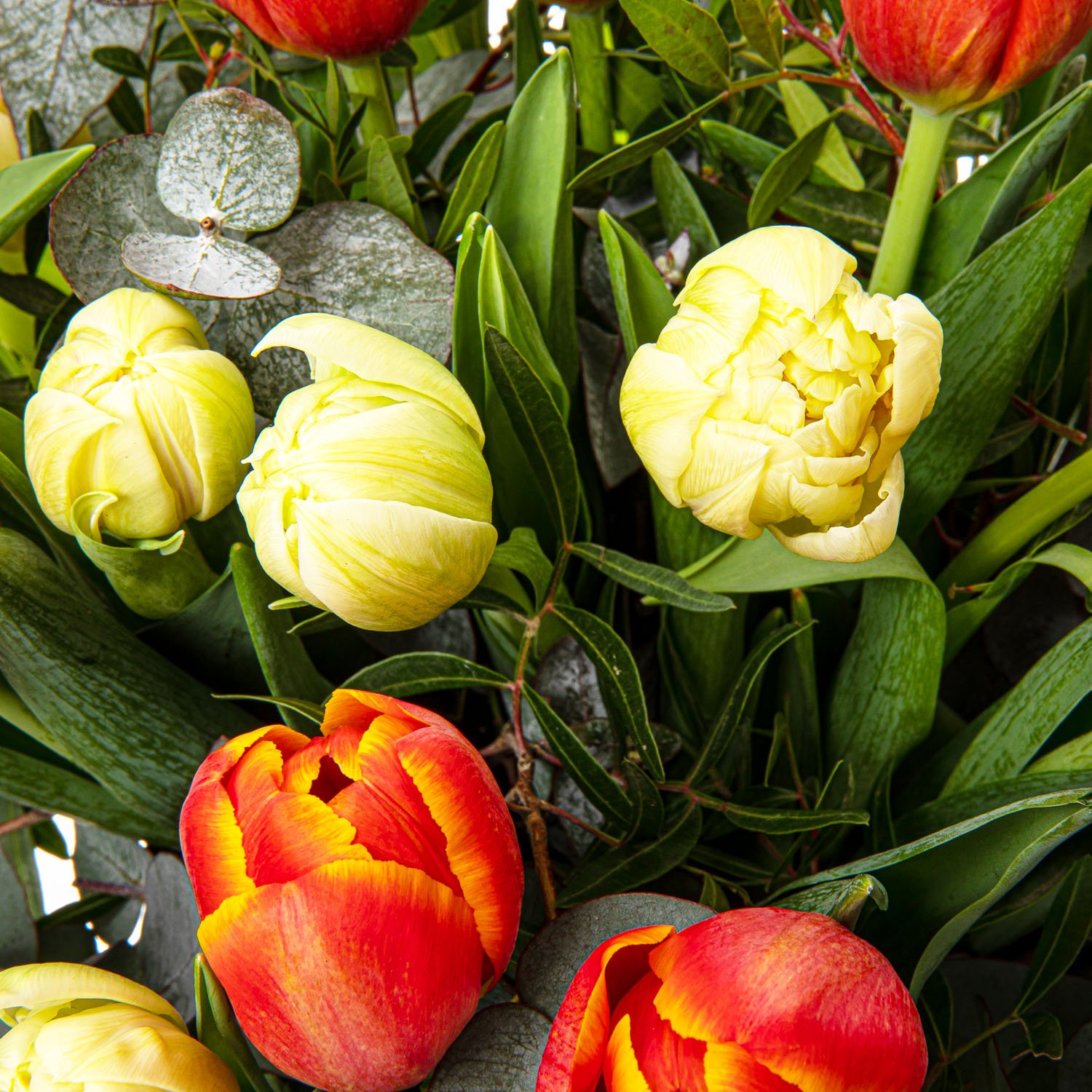 Standardní 8 ks tulipán oranžový, 7 ks tulipán bílý, eucalyptus a dekorativní zeleň (sala)