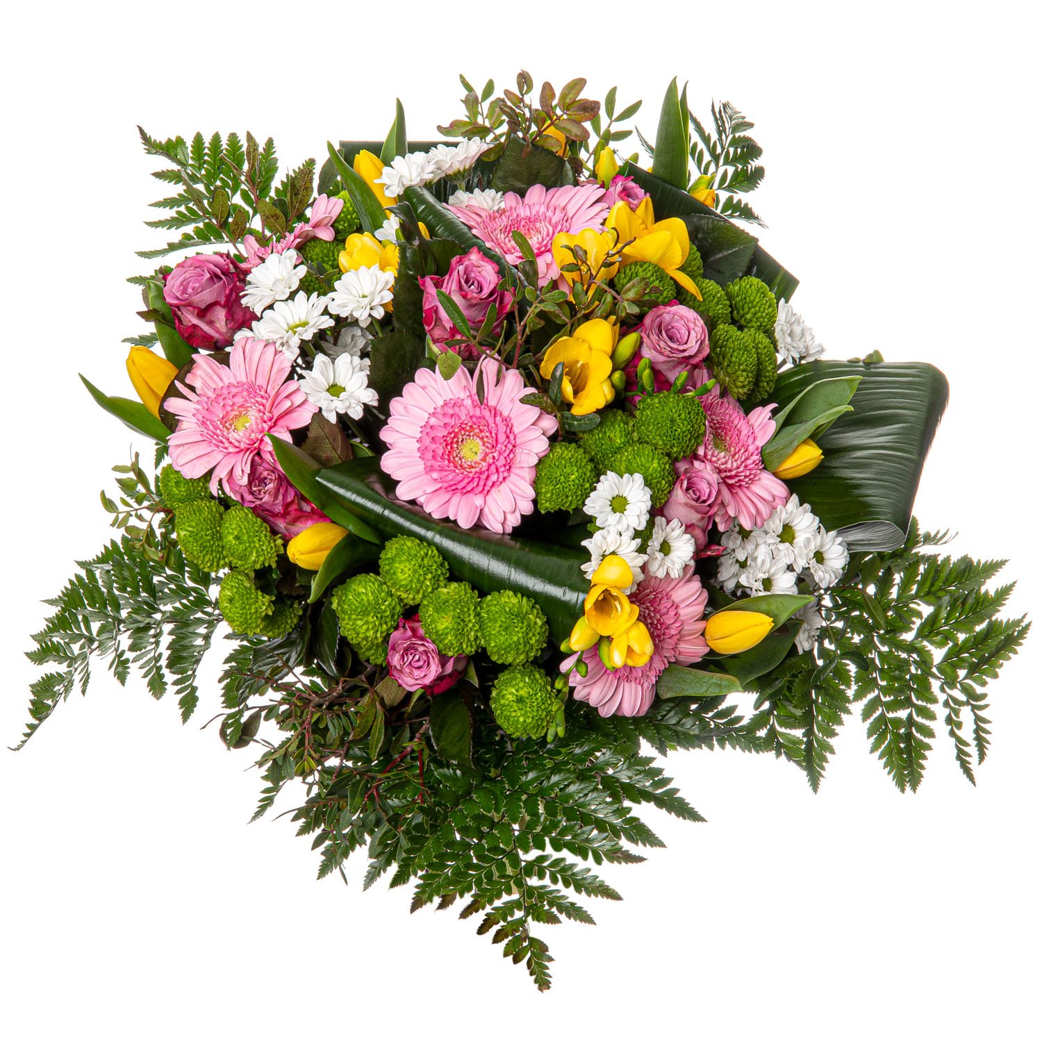 5 ks růže fialová/růžová, 5 ks gerbera mini růžová, 4 ks santini zelená, 4 ks santini bílá, 4 ks frésie, 7 ks tulipán žlutý a dekorativní zeleň (aspidistra, rumora, pistacie)