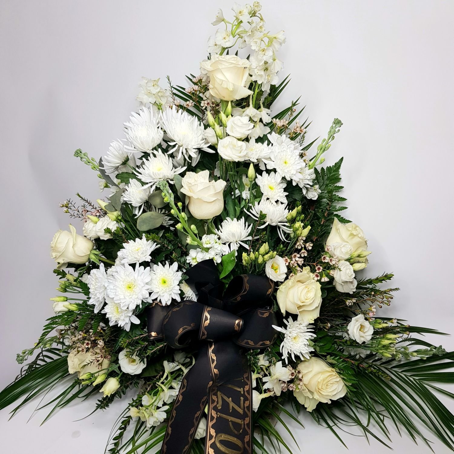Smuteční vypichované aranžmá číslo 50, je tvořeno z bílých růží, bílé eustomy, bílých chrysanthém, bílé mathioly a bílého waxu. Květy jsou doplněné zelení a smuteční stuhou s nápisem dle Vašeho přání. Květy jsou naaranžované do hmoty, která je nasáklá vodou a proto déle vydrží.
