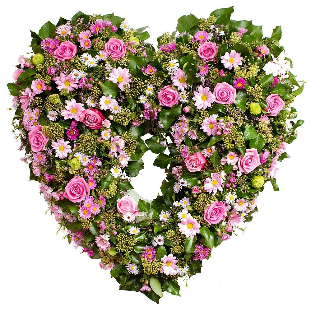 | 15 ks ruže, 10 ks chryzantéma, 5 ks santini, 20 ks eustoma, 10 ks limonium, florex srdce 60cm, smutečná stuha, zeleň |