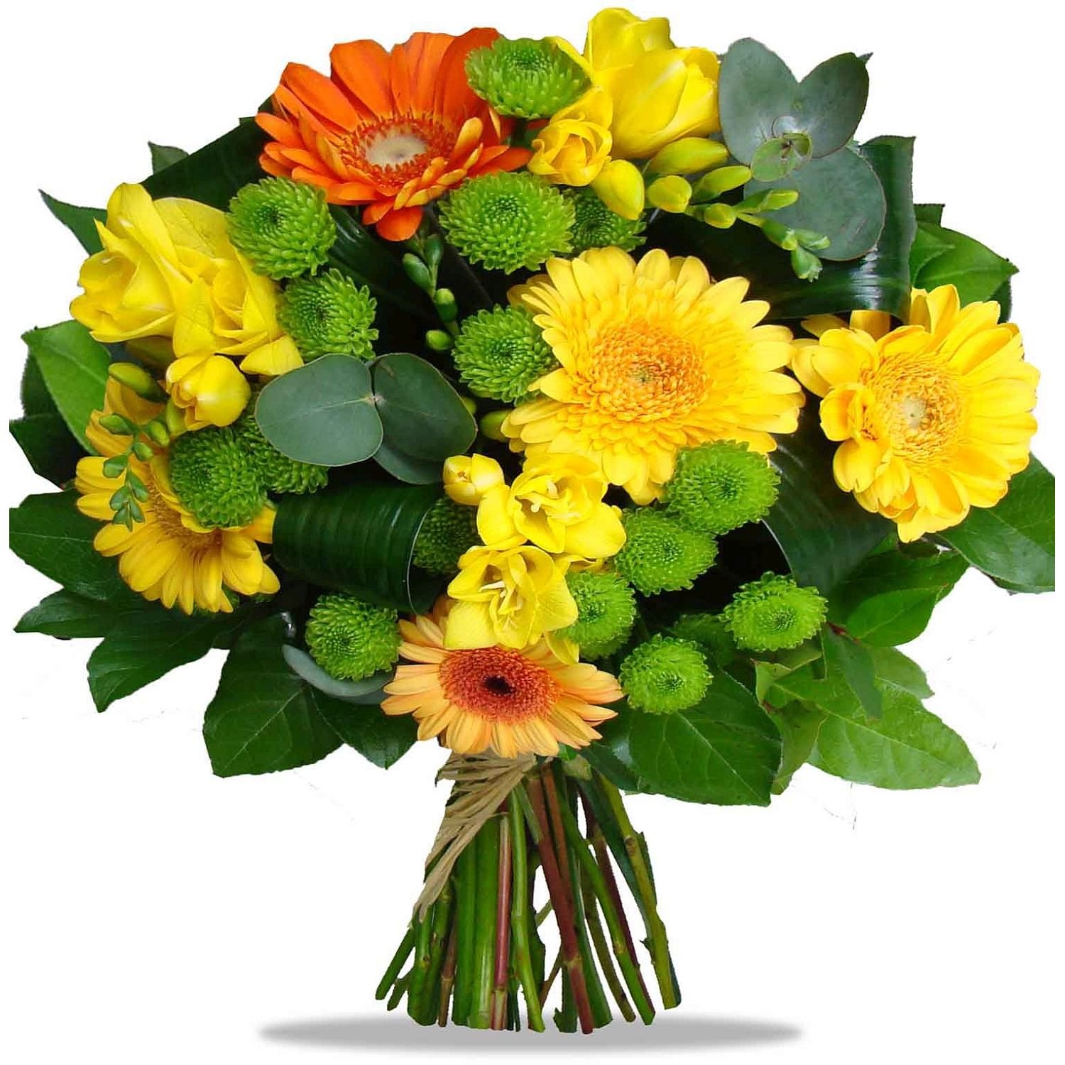 Великий 9 гербера міні, 5 сантіні (хризантема), 5 фрезія, зелені наповнювачі
